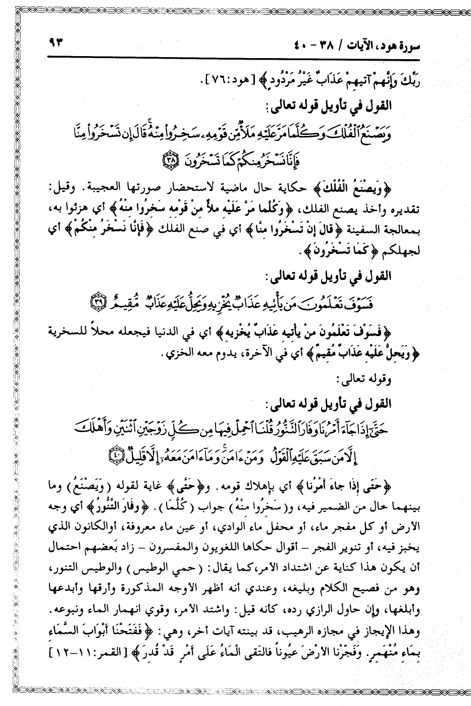 حَتَّى إِذا جاءَ أَمْرُنا وَفارَ التَّنُّورُ قُلْنَا احْمِلْ فِيها مِنْ كُلٍّ زَوْجَيْنِ اثْنَيْنِ وَأَهْلَكَ إِلاَّ مَنْ سَبَقَ عَلَيْهِ الْقَوْلُ وَمَنْ آمَنَ وَما آمَنَ مَعَهُ إِلاَّ قَلِيلٌ (40)