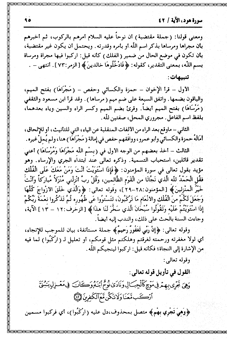 الثالث- أخذ بعضهم من الوجه الأول في (بسم الله مجراها ومرساها) أعني تقدير قائلين، استحباب التسمية. وذكره تعالى عند ابتداء الجري والإرساء. وهو مؤيد بقول تعالى في سورة المؤمنون: فَإِذَا اسْتَوَيْتَ أَنْتَ وَمَنْ مَعَكَ عَلَى الْفُلْكِ فَقُلِ الْحَمْدُ لِلَّهِ الَّذِي نَجَّانا مِنَ الْقَوْمِ الظَّالِمِينَ، وَقُلْ رَبِّ أَنْزِلْنِي مُنْزَلًا مُبارَكاً وَأَنْتَ خَيْرُ الْمُنْزِلِينَ [المؤمنون: 28- 29] ، وقوله تعالى: وَالَّذِي خَلَقَ الْأَزْواجَ كُلَّها وَجَعَلَ لَكُمْ مِنَ الْفُلْكِ وَالْأَنْعامِ ما تَرْكَبُونَ، لِتَسْتَوُوا عَلى ظُهُورِهِ ثُمَّ تَذْكُرُوا نِعْمَةَ رَبِّكُمْ إِذَا اسْتَوَيْتُمْ عَلَيْهِ وَتَقُولُوا سُبْحانَ الَّذِي سَخَّرَ لَنا هذا [الزخرف: 12- 13] الآية، وجاءت السنة بالحث على ذلك، والندب إليه أيضا.
