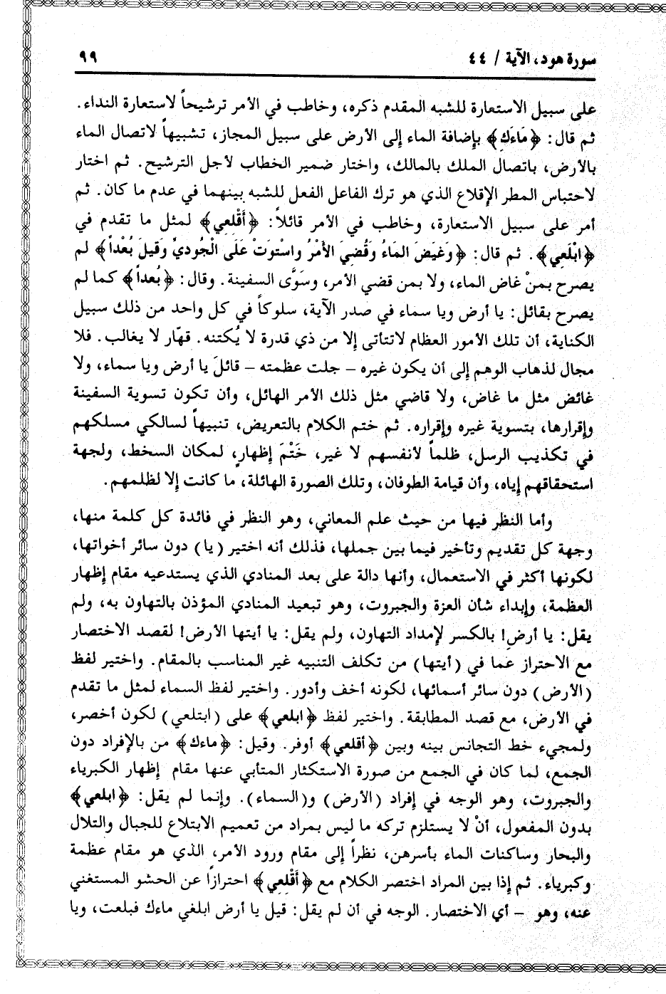 ثم قال: ماءَكِ بإضافة الماء إلى الأرض على سبيل المجاز، تشبيها لاتصال الماء بالأرض، باتصال الملك بالمالك، واختار ضمير الخطاب لأجل الترشيح. ثم اختار لاحتباس المطر الإقلاع الذي هو ترك الفاعل الفعل للشبه بينهما في عدم ما كان. ثم أمر على سبيل الاستعارة، وخاطب في الأمر قائلا: أَقْلِعِي لمثل ما تقدم في ابْلَعِي. ثم قال: وَغِيضَ الْماءُ وَقُضِيَ الْأَمْرُ وَاسْتَوَتْ عَلَى الْجُودِيِّ وَقِيلَ بُعْداً لم يصرح بمن غاض الماء، ولا بمن قضي الأمر، وسوّى السفينة. وقال: بُعْداً كما لم يصرح بقائل: يا أرض ويا سماء في صدر الآية، سلوكا في كل واحد من ذلك سبيل الكناية، أن تلك الأمور العظام لا تتأتى إلا من ذي قدرة لا يكتنه. قهّار لا يغالب. فلا مجال لذهاب الوهم إلى أن يكون غيره- جلت عظمته- قائل يا أرض ويا سماء، ولا غائض مثل ما غاض، ولا قاضي مثل ذلك الأمر الهائل، وأن تكون تسوية السفينة وإقرارها، بتسوية غيره وإقراره. ثم ختم الكلام بالتعريض، تنبيها لسالكي مسلكهم في تكذيب الرسل، ظلما لأنفسهم لا غير، ختم إظهار، لمكان السخط، ولجهة استحقاقهم إياه، وأن قيامة الطوفان، وتلك الصورة الهائلة، ما كانت إلا لظلمهم.