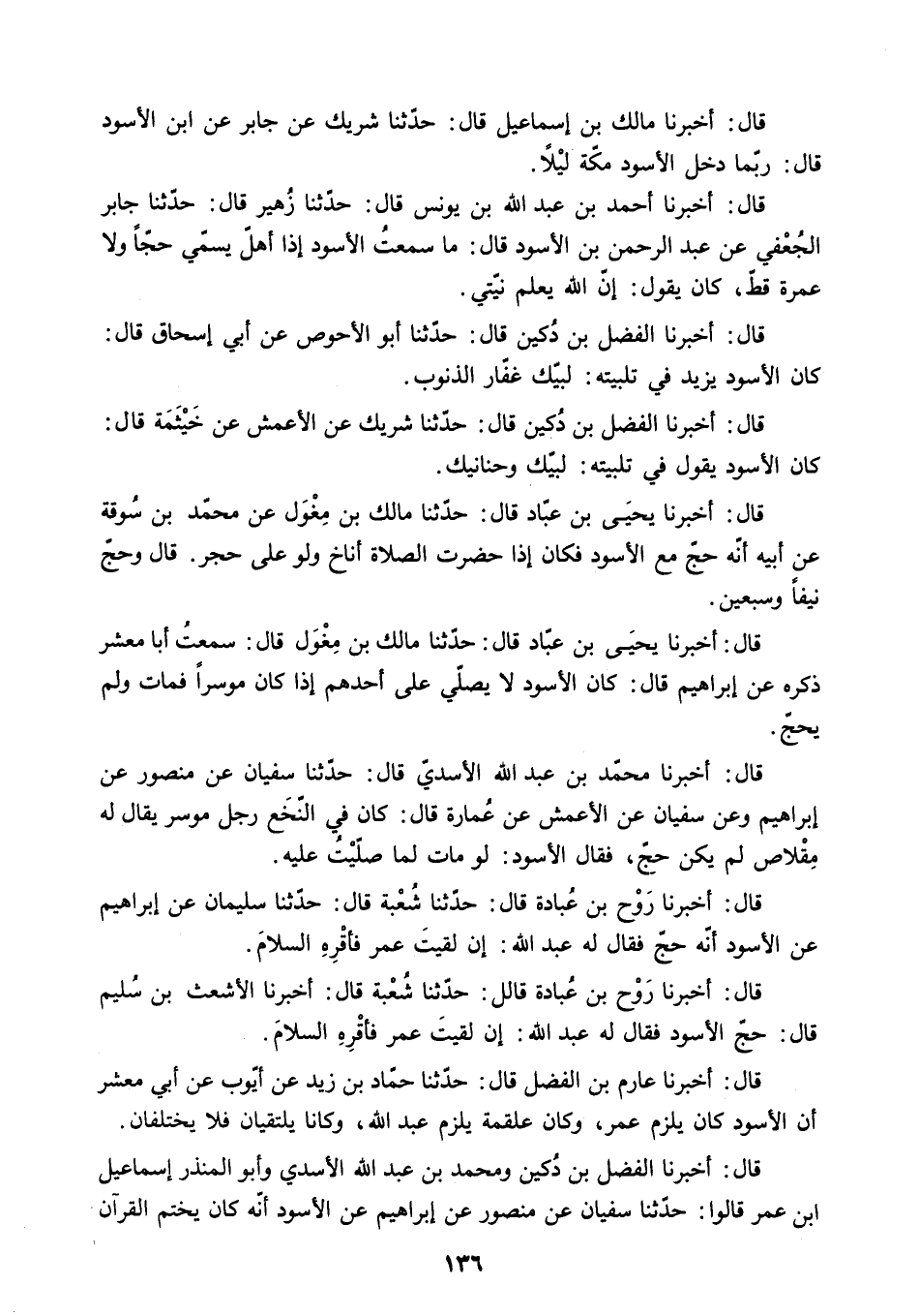 قَالَ: أَخْبَرَنَا يَحْيَى بْنُ عَبَّادٍ قَالَ: حَدَّثَنَا مَالِكُ بْنُ مِغْوَلٍ عَنْ مُحَمَّدِ بْنِ سُوقَةَ عَنْ أَبِيهِ أَنَّهُ حَجَّ مَعَ الأَسْوَدِ فَكَانَ إِذَا حَضَرَتِ الصَّلاةُ أَنَاخَ وَلَوْ عَلَى حَجَرٍ. قال وحج نيفا وسبعين.