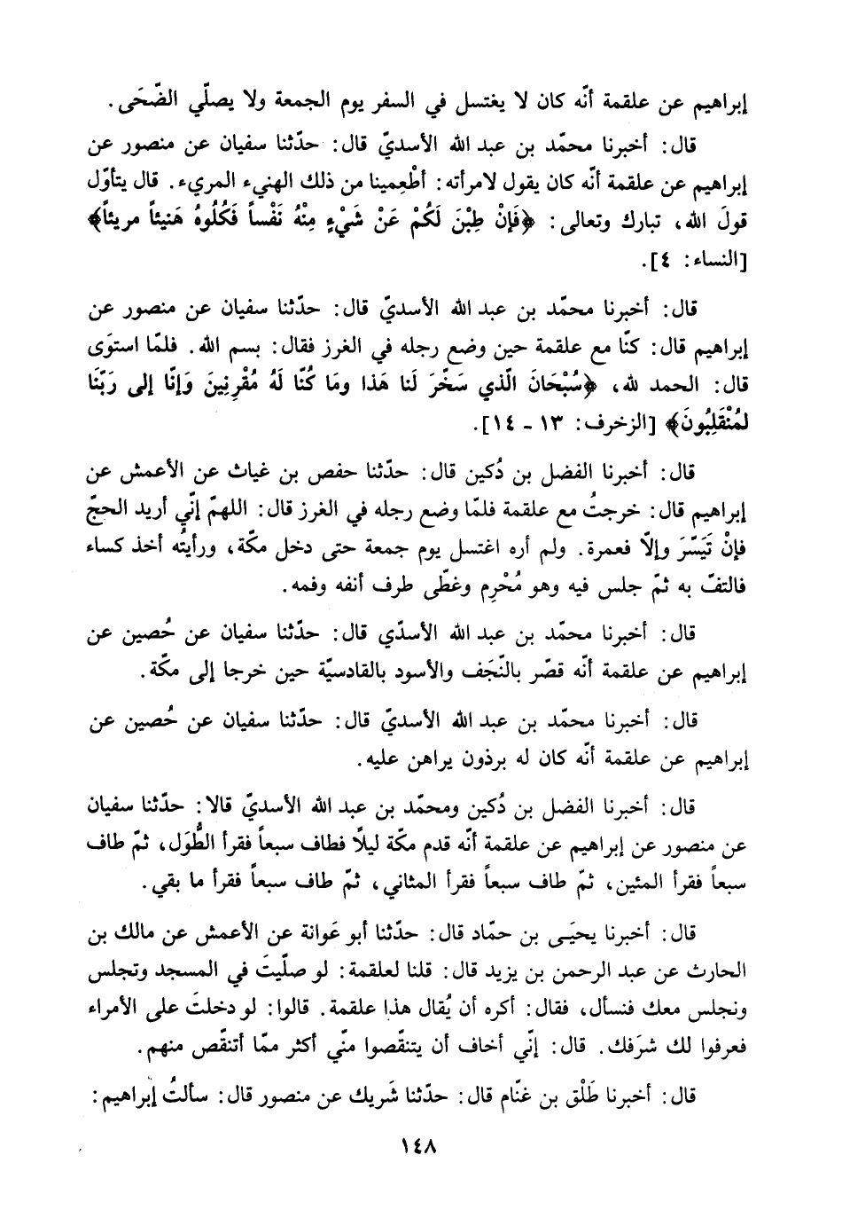 قَالَ: أَخْبَرَنَا مُحَمَّدُ بْنُ عَبْدِ اللَّهِ الأَسَدِيُّ قَالَ: حَدَّثَنَا سُفْيَانُ عَنْ مَنْصُورٍ عَنْ إِبْرَاهِيمَ قَالَ: كُنَّا مَعَ عَلْقَمَةَ حِينَ وَضَعَ رِجْلَهُ فِي الْغَرْزِ فَقَالَ: بِسْمِ اللَّهِ. فَلَمَّا اسْتَوَى قَالَ: الْحَمْدُ لِلَّهِ. «سُبْحانَ الَّذِي سَخَّرَ لَنا هَذَا وَما كُنَّا لَهُ مُقْرِنِينَ وَإِنَّا إِلى رَبِّنا لَمُنْقَلِبُونَ» الزخرف: - 14.