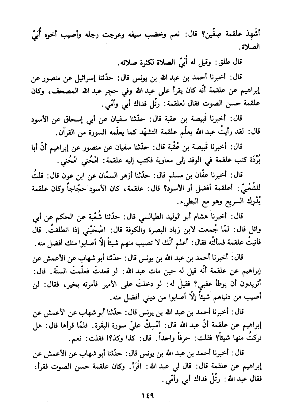 قَالَ: أَخْبَرَنَا أَحْمَدُ بْنُ عَبْدِ اللَّهِ بْنِ يُونُسَ قَالَ: حَدَّثَنَا إِسْرَائِيلُ عَنْ مَنْصُورٍ عَنْ إِبْرَاهِيمَ عَنْ عَلْقَمَةَ أَنَّهُ كَانَ يَقْرَأُ عَلَى عَبْدِ اللَّهِ وَفِي حِجْرِ عَبْدِ اللَّهِ الْمُصْحَفَ. وَكَانَ عَلْقَمَةُ حَسَنَ الصَّوْتِ فَقَالَ لِعَلْقَمَةَ: رَتِّلْ فداك أبي وأمي.