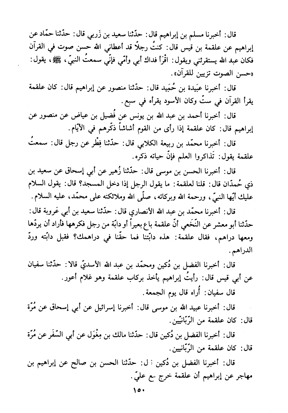 قال: أَخْبَرَنَا عُبَيْدَةُ بْنُ حُمَيْدٍ قَالَ: حَدَّثَنَا مَنْصُورٌ عَنْ إِبْرَاهِيمَ قَالَ: كَانَ عَلْقَمَةُ يَقْرَأُ الْقُرْآنَ فِي سِتٍّ وَكَانَ الأَسْوَدُ يَقْرَأْهُ فِي سَبْعٍ.