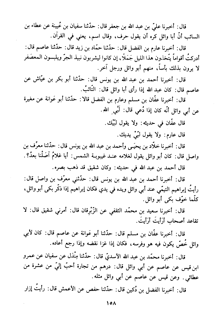 قال: أَخْبَرَنَا خَلادُ بْنُ يَحْيَى وَأَحْمَدُ بْنُ عَبْدِ اللَّهِ بْنِ يُونُسَ قَالَ: حَدَّثَنَا مُعَرِّفُ بْنُ وَاصِلٍ قَالَ: كَانَ أَبُو وَائِلٍ يَقُولُ لِغُلامِهِ عِنْدَ غَيْبُوبَةِ الشَّمْسِ: أَيَا غلام آصلنا بَعْدُ؟.