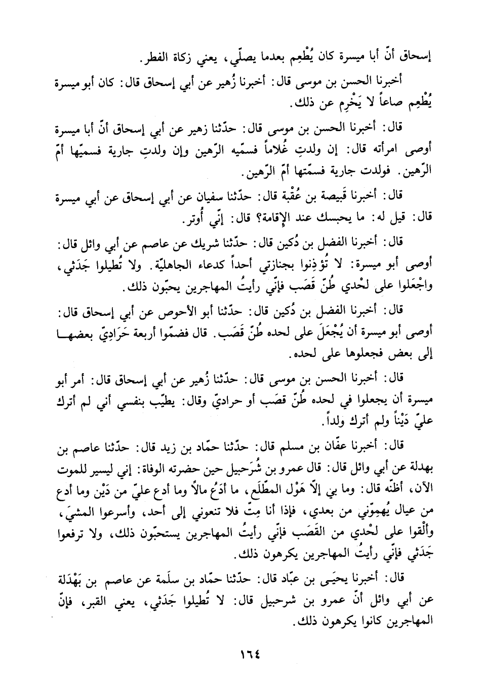 قَالَ: أَخْبَرَنَا الْحَسَنُ بْنُ مُوسَى قَالَ: حَدَّثَنَا زُهَيْرٌ عَنْ أَبِي إِسْحَاقَ قَالَ: أَمَرَ أَبُو مَيْسَرَةَ أَنْ يَجْعَلُوا فِي لَحْدِهِ طُنُّ قَصَبٍ أَوْ حَرَادِيِّ وَقَالَ: يَطِيبُ بِنَفْسِي أَنِّي لَمْ أترك علي دينا ولم أترك ولدا.