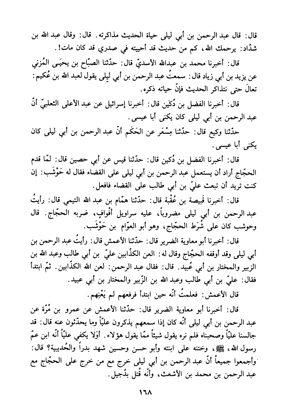 قَالَ: أَخْبَرَنَا أَبُو مُعَاوِيَةَ الضَّرِيرُ قَالَ: حَدَّثَنَا الأَعْمَشُ قَالَ: رَأَيْتُ عَبْدَ الرَّحْمَنِ بْنَ أَبِي لَيْلَى وَقَدْ أَوْقَفَهُ الْحَجَّاجُ وَقَالَ لَهُ: الْعَنِ الْكَذَّابِينَ عَلِيَّ بْنَ أَبِي طَالِبٍ وَعَبْدَ اللَّهِ بن الزبير والمختار بن أبي عبيد. قال: فَقَالَ عَبْدُ الرَّحْمَنِ: لَعَنَ اللَّهُ الْكَذَّابِينَ. ثُمَّ ابْتَدَأَ فَقَالَ: عَلِيُّ بْنُ أَبِي طَالِبٍ وَعَبْدُ الله بن الزبير والمختار بن أبي عبيد.
