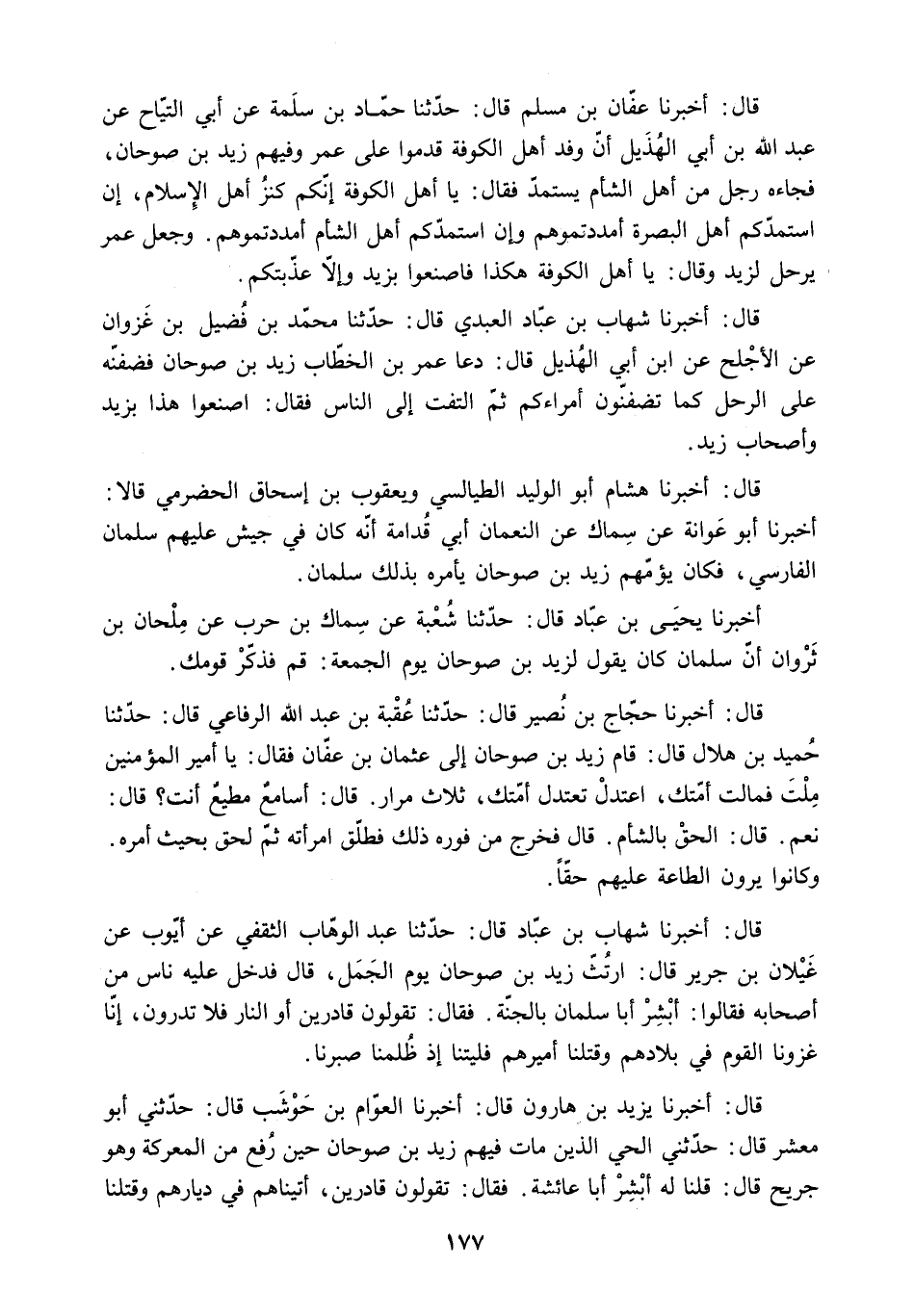 قَالَ: أَخْبَرَنَا يَزِيدُ بْنُ هَارُونَ قَالَ: أَخْبَرَنَا الْعَوَّامُ بْنُ حَوْشَبٍ قَالَ: حَدَّثَنِي أَبُو مَعْشَرٍ قَالَ: حَدَّثَنِي الْحَيُّ الَّذِينَ مَاتَ فِيهِمْ زَيْدُ بْنُ صُوحَانَ حِينَ رُفِعَ مِنَ الْمَعْرَكَةِ وَهُوَ جَرِيحٌ قَالَ: قُلْنَا لَهُ أَبْشِرْ أَبَا عَائِشَةَ. فَقَالَ: تَقُولُونَ قَادِرِينَ. أَتَيْنَاهُمْ فِي دِيَارِهِمْ وَقَتَلْنَا