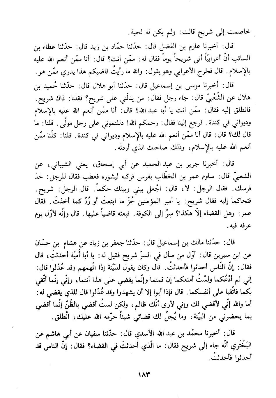 قَالَ: أَخْبَرَنَا عَارِمُ بْنُ الْفَضْلِ قَالَ: حَدَّثَنَا حَمَّادُ بْنُ زَيْدٍ قَالَ: حَدَّثَنَا عَطَاءُ بْنُ السَّائِبِ أَنَّ أَعْرَابِيًّا أَتَى شُرَيْحًا يَوْمًا فَقَالَ لَهُ: مِمَّنْ أَنْتَ؟ قَالَ: أَنَا مِمَّنْ أَنْعَمَ اللَّهُ عَلَيْهِ بِالإِسْلامِ. قَالَ فَخَرَجَ الأَعْرَابِيُّ وَهُوَ يَقُولُ: وَاللَّهِ مَا رَأَيْتُ قَاضِيكُمْ هَذَا يَدْرِي ممن هو.