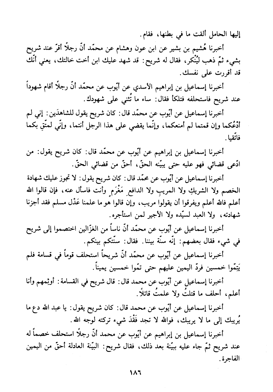أَخْبَرَنَا إِسْمَاعِيلُ بْنُ إِبْرَاهِيمَ عَنْ أَيُّوبَ عَنْ مُحَمَّدٍ قَالَ: كَانَ شُرَيْحٌ يَقُولُ: مَنِ ادَّعَى قَضَائِيَ فَهُوَ عَلَيْهِ حَتَّى يُبَيِّنَهُ الْحَقُّ. أَحَقُّ مِنْ قَضَائِي الْحَقُّ.