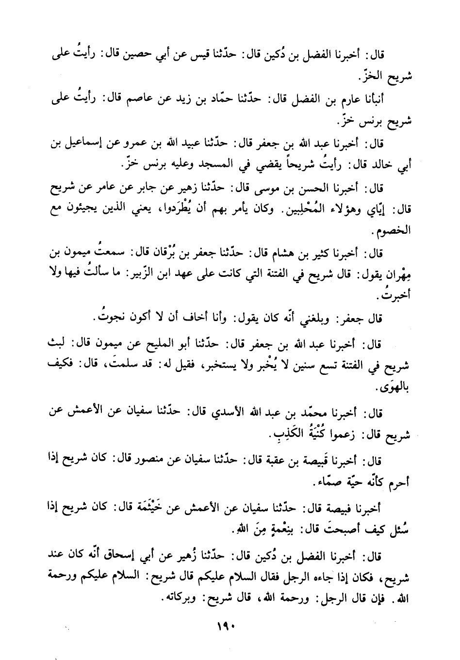 قَالَ: أَخْبَرَنَا الْفَضْلُ بْنُ دُكَيْنٍ قَالَ: حَدَّثَنَا قَيْسٌ عَنْ أَبِي حَصِينٍ قَالَ: رَأَيْتُ عَلَى شُرَيْحٍ الْخَزَّ.