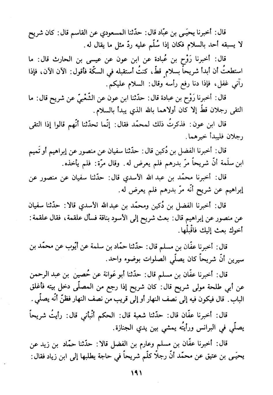 قَالَ: أَخْبَرَنَا يَحْيَى بْنُ عَبَّادٍ قَالَ: حَدَّثَنَا الْمَسْعُودِيُّ عَنِ الْقَاسِمِ قَالَ: كَانَ شُرَيْحٌ لا يَسْبِقُهُ أَحَدٌ بِالسَّلامِ فَكَانَ إِذَا سُلِّمَ عَلَيْهِ رد مثل ما يقال له.