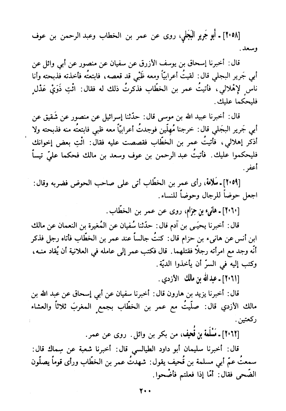 قَالَ: أَخْبَرَنَا إِسْحَاقُ بْنُ يُوسُفَ الأَزْرَقُ عَنْ سُفْيَانَ عَنْ مَنْصُورٍ عَنْ أَبِي وَائِلٍ عَنْ أَبِي جَرِيرٍ الْبَجَلِيِّ قَالَ: لَقِيتُ أَعْرَابِيًّا وَمَعَهُ ظَبْيٌ قَدْ قَعَصَهُ. فَابْتَعْتُهُ فَأَخَذْتُهُ فَذَبَحْتُهُ وَأَنَا نَاسٍ لإِهْلالِي. فَأَتَيْتُ عُمَرَ بْنَ الْخَطَّابِ فَذَكَرْتُ ذَلِكَ لَهُ فَقَالَ: ائْتِ ذَوَيْ عَدْلٍ فَلْيَحْكُمَا عَلَيْكَ.