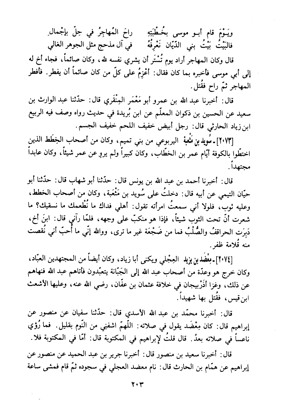 قَالَ: أَخْبَرَنَا أَحْمَدُ بْنُ عَبْدِ اللَّهِ بْنِ يُونُسَ قَالَ: حَدَّثَنَا أَبُو شِهَابٍ قَالَ: حَدَّثَنَا أَبُو حَيَّانَ التَّيْمِيُّ عَنْ أَبِيهِ قَالَ: دَخَلْتُ عَلَى سُوَيْدِ بْنِ مَثْعَبَةَ. وَكَانَ مِنْ أَصْحَابِ الْخِطَطِ.