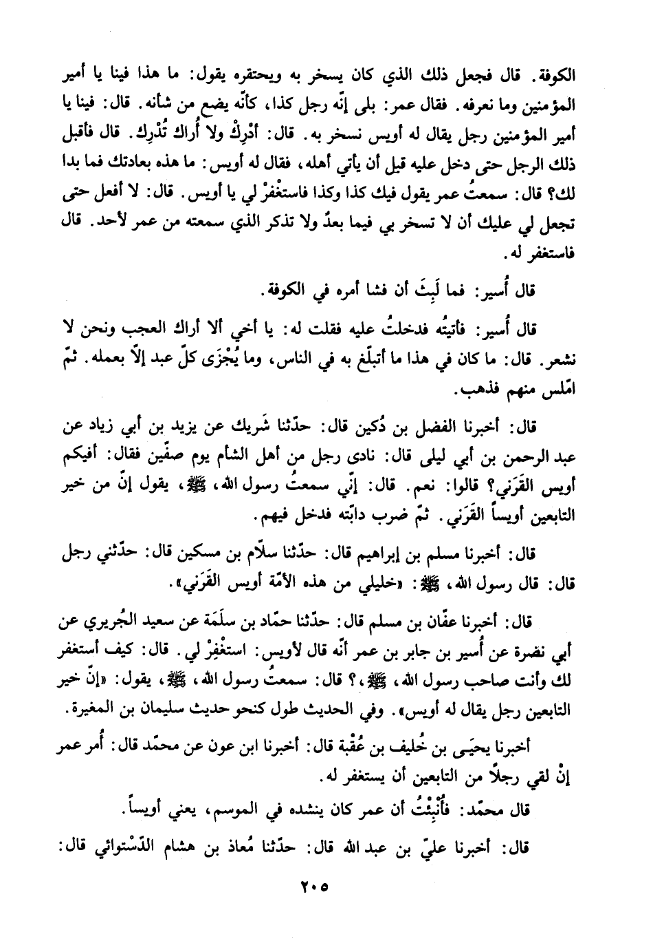 الْكُوفَةَ. قَالَ فَجَعَلَ ذَلِكَ الَّذِي كَانَ يَسْخَرُ بِهِ وَيَحْتَقِرُهُ يَقُولُ: مَا هَذَا فِينَا يَا أَمِيرَ الْمُؤْمِنِينَ وَمَا نَعْرِفُهُ. فَقَالَ عُمَرُ: بَلَى إِنَّهُ رَجُلٌ كَذَا. كَأَنَّهُ يَضَعُ مِنْ شَأْنِهِ. قَالَ: فِينَا يَا أَمِيرَ الْمُؤْمِنِينَ رَجُلٌ يُقَالُ لَهُ أُوَيْسٌ نَسْخَرُ بِهِ. قَالَ: أَدْرِكْ وَلا أَرَاكَ تُدْرِكُ. قَالَ فَأَقْبَلَ ذَلِكَ الرَّجُلُ حَتَّى دَخَلَ عَلَيْهِ قَبْلَ أَنْ يَأْتِيَ أَهْلَهُ. فَقَالَ لَهُ أُوَيْسٌ: مَا هَذِهِ بِعَادَتِكَ فَمَا بَدَا لَكَ؟ قَالَ: سَمِعْتُ عُمَرَ يَقُولُ فِيكَ كَذَا وَكَذَا فَاسْتَغْفِرْ لِي يَا أُوَيْسُ. قَالَ: لا أَفْعَلُ حَتَّى تَجْعَلَ لِي عَلَيْكَ أَنْ لا تَسْخَرَ بِي فِيمَا بَعْدُ وَلا تَذْكُرَ الَّذِي سَمِعْتَهُ مِنْ عُمَرَ لأَحَدٍ. قَالَ فَاسْتَغْفَرَ لَهُ.