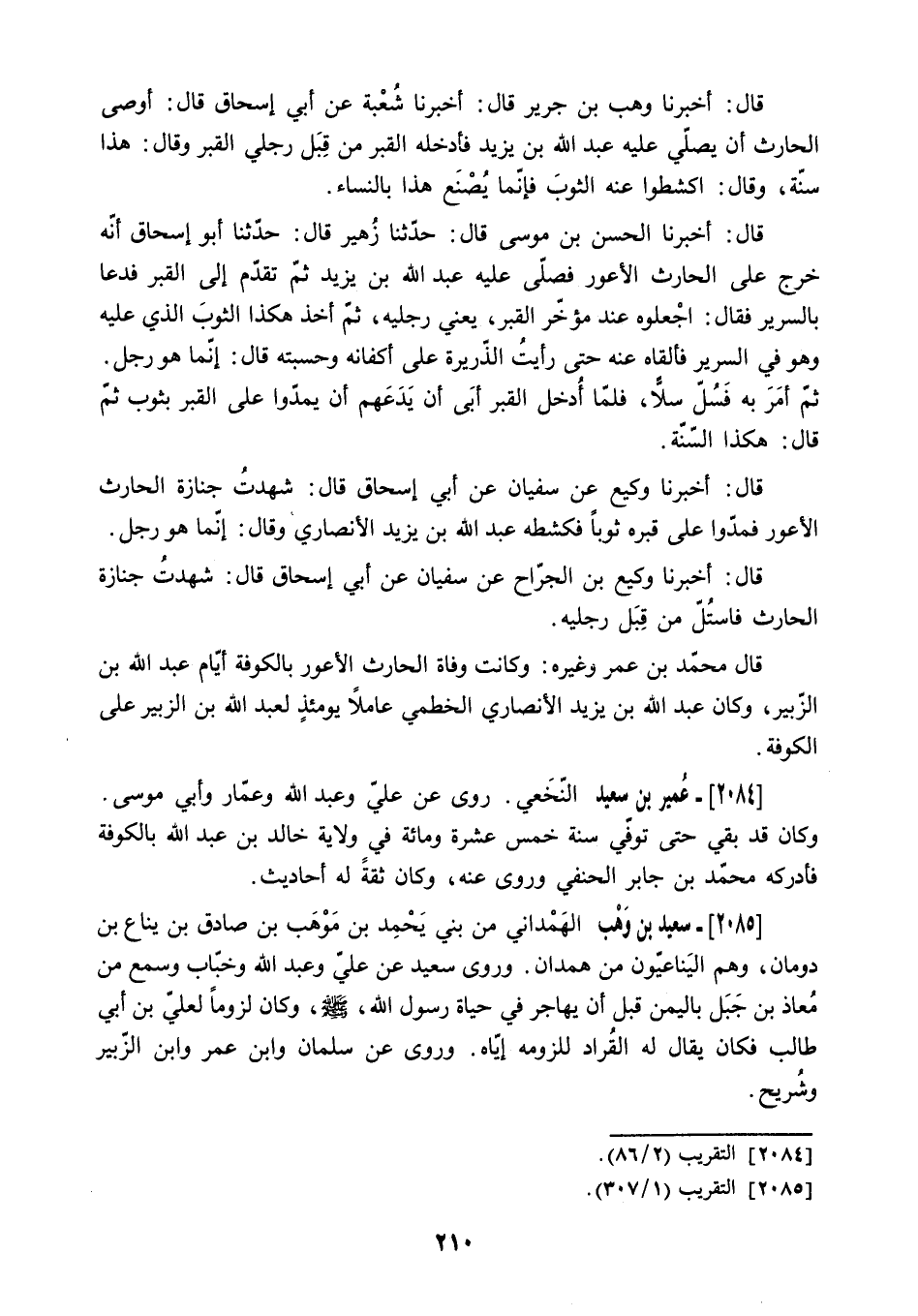 قال: أَخْبَرَنَا وَكِيعٌ عَنْ سُفْيَانَ عَنْ أَبِي إِسْحَاقَ قَالَ: شَهِدْتُ جَنَازَةَ الْحَارِثِ الأَعْوَرِ فَمَدُّوا عَلَى قَبْرِهِ ثَوْبًا فَكَشَطَهُ عَبْدُ اللَّهِ بْنُ يَزِيدَ الأنصاري وقال: إنما هو رجل.