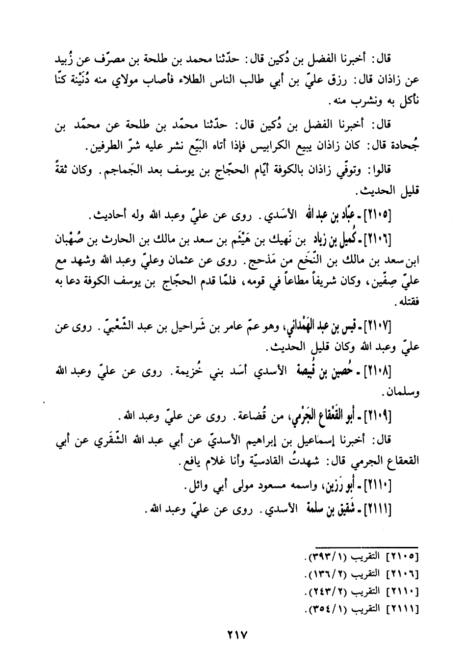 قَالَ: أَخْبَرَنَا الْفَضْلُ بْنُ دُكَيْنٍ قَالَ: حَدَّثَنَا مُحَمَّدُ بْنُ طَلْحَةَ بْنِ مُصَرِّفٍ عَنْ زُبَيْدٍ عَنْ زَاذَانَ قَالَ: رَزَقَ عَلِيُّ بْنُ أَبِي طَالِبٍ النَّاسَ الطِّلاءَ فَأَصَابَ مَوْلايَ مِنْهُ دُنَيْنَةً كنا نأكل به ونشرب مِنْهُ.