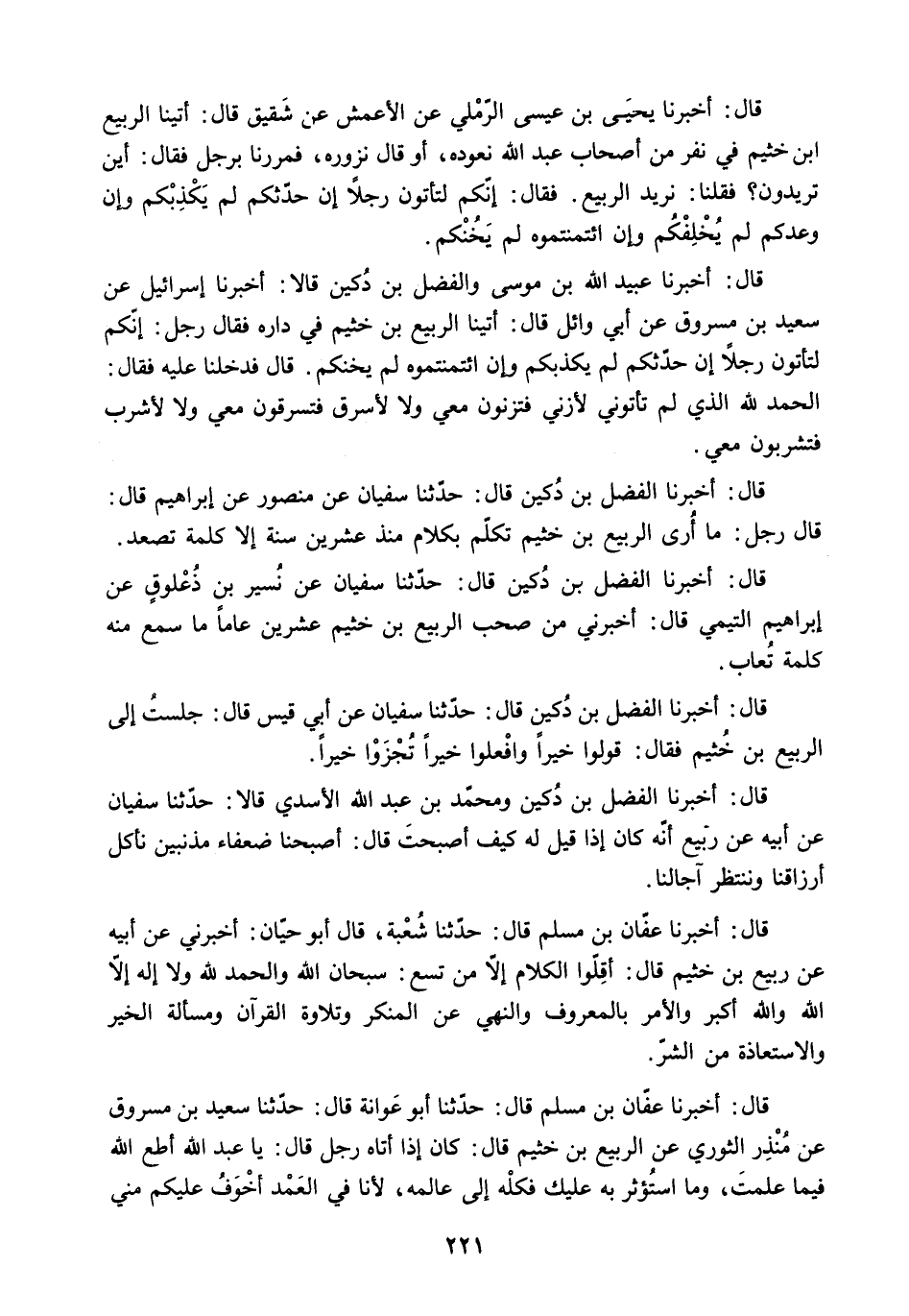 قَالَ: أَخْبَرَنَا الْفَضْلُ بْنُ دُكَيْنٍ قَالَ: حَدَّثَنَا سُفْيَانُ عَنْ نُسَيْرِ بْنِ ذُعْلُوقٍ عَنْ إِبْرَاهِيمَ التَّيْمِيِّ قَالَ: أَخْبَرَنِي مَنْ صَحِبَ الرَّبِيعَ بْنَ خُثَيْمٍ عِشْرِينَ عَامًا مَا سَمِعَ مِنْهُ كَلِمَةً تعاب.