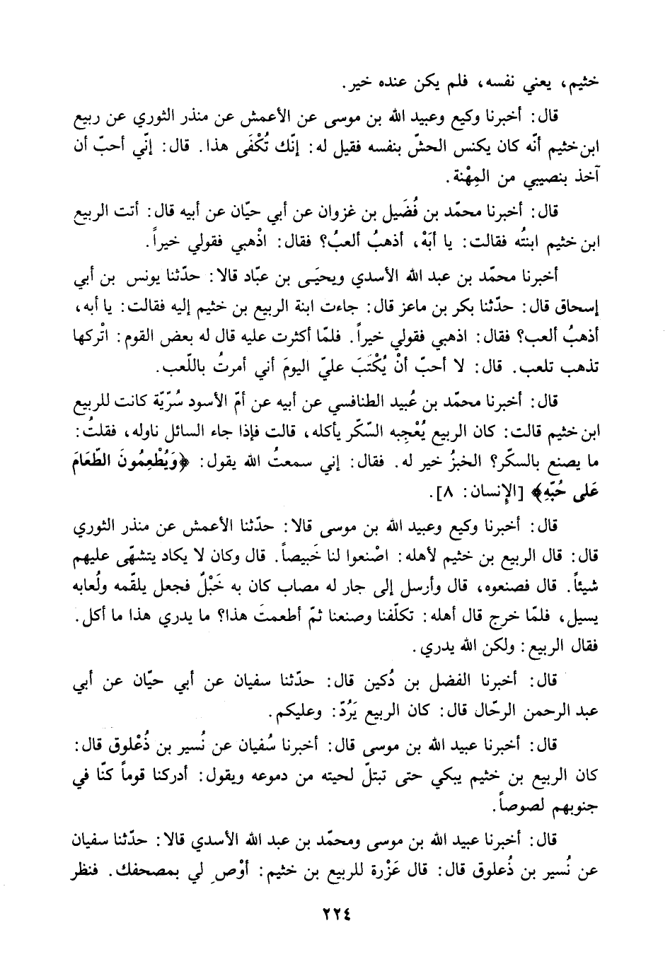 قال: أَخْبَرَنَا وَكِيعٌ وَعُبَيْدُ اللَّهِ بْنُ مُوسَى قَالا: حَدَّثَنَا الأَعْمَشُ عَنْ مُنْذِرٍ الثَّوْرِيِّ قَالَ: قَالَ الرَّبِيعَ بْنَ خُثَيْمٍ لأَهْلِهِ: اصْنَعُوا لَنَا خَبِيصًا. قَالَ وَكَانَ لا يَكَادُ يَتَشَهَّى عَلَيْهِمْ شَيْئًا. قَالَ فَصَنَعُوهُ. قَالَ وَأَرْسَلَ إِلَى جَارٍ لَهُ مُصَابٍ كَانَ بِهِ خَبْلٌ فَجَعَلَ يُلْقِمُهُ وَلُعَابُهُ يَسِيلُ. فَلَمَّا خَرَجَ قَالَ أَهْلُهُ: تَكَلَّفْنَا وَصَنَعْنَا ثُمَّ أَطْعَمْتَ هَذَا؟ مَا يَدْرِي هَذَا مَا أكل.