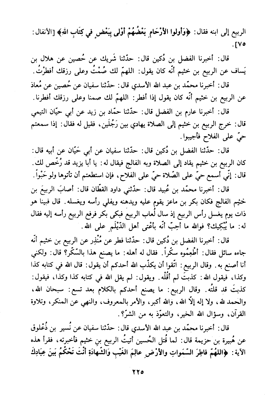 قَالَ: أَخْبَرَنَا مُحَمَّدُ بْنُ عَبْدِ اللَّهِ الأَسَدِيُّ قَالَ: حَدَّثَنَا سُفْيَانُ عَنْ نُسَيْرِ بْنِ ذُعْلُوقٍ عَنْ هُبَيْرَةَ بْنِ حَزِيمَةَ قَالَ: لَمَّا قُتِلَ الْحُسَيْنُ أَتَيْتُ الرَّبِيعَ بْنَ خُثَيْمٍ فَأَخْبَرْتُهُ. فَقَرَأَ هذه الآية: «اللَّهُمَّ فاطِرَ السَّماواتِ وَالْأَرْضِ عالِمَ الْغَيْبِ وَالشَّهادَةِ أَنْتَ تَحْكُمُ بَيْنَ عِبادِكَ