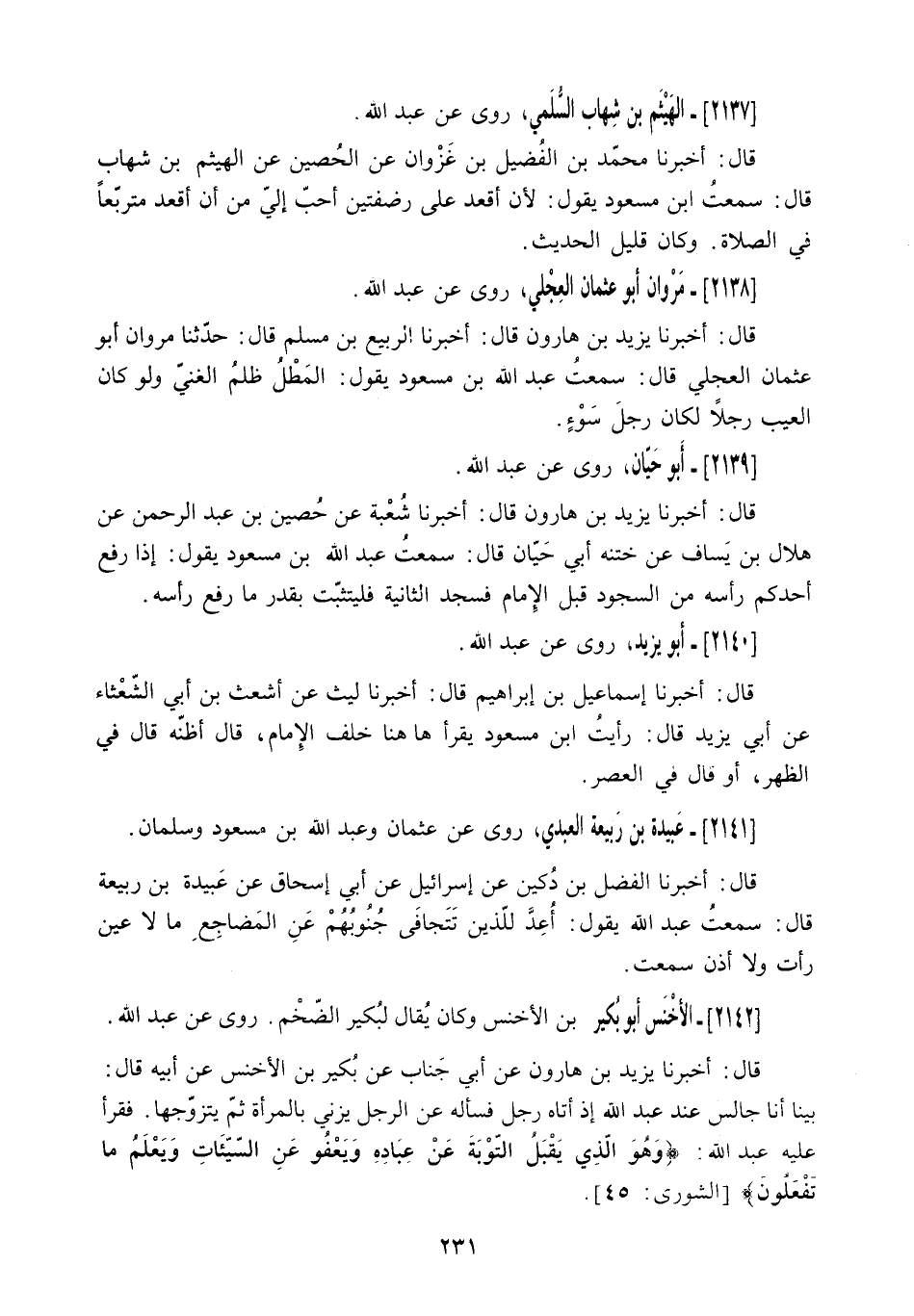 قال: أَخْبَرَنَا مُحَمَّدُ بْنُ الْفُضَيْلِ بْنِ غَزْوَانَ عَنْ الْحُصَيْنِ عَنِ الْهَيْثَمِ بْنِ شِهَابٍ قَالَ: سَمِعْتُ ابْنَ مَسْعُودٍ يَقُولُ: لأَنْ أَقْعُدَ عَلَى رَضْفَتَيْنِ أَحَبُّ إِلَيَّ مِنْ أَنْ أَقْعُدَ مُتَرَبِّعًا فِي الصَّلاةِ. وَكَانَ قَلِيلَ الْحَدِيثِ.
