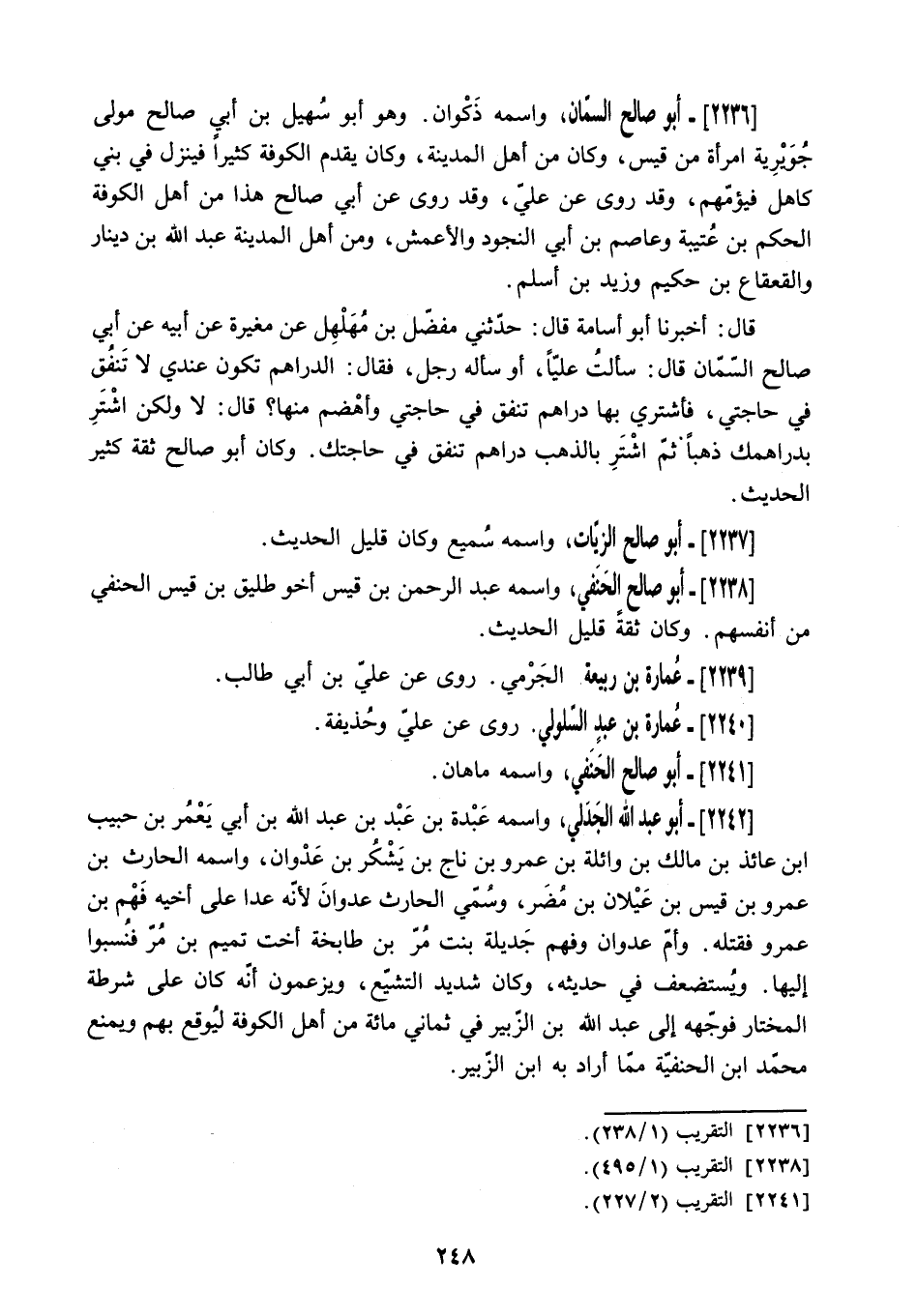 قال: أَخْبَرَنَا أَبُو أُسَامَةَ قَالَ: حَدَّثَنِي مُفَضَّلُ بْنُ مُهَلْهَلٍ عَنْ مُغِيرَةَ عَنْ أَبِيهِ عَنْ أَبِي صَالِحٍ السَّمَّانِ قَالَ: [سَأَلْتُ عَلِيًّا. أَوْ سَأَلَهُ رَجُلٌ. فَقَالَ: الدَّرَاهِمُ تَكُونُ عِنْدِي لا تُنْفَقُ فِي حَاجَتِي. فَأَشْتَرِي بِهَا دَرَاهِمَ تُنْفَقُ فِي حَاجَتِي وَأَهْضِمُ مِنْهَا؟ قَالَ: لا وَلَكِنِ اشْتَرِ بِدَرَاهِمِكَ ذَهَبًا ثُمَّ اشْتَرِ بِالذَّهَبِ دَرَاهِمَ تُنْفَقُ فِي حَاجَتِكَ.] وَكَانَ أَبُو صَالِحٍ ثِقَةً كَثِيرَ الْحَدِيثِ.