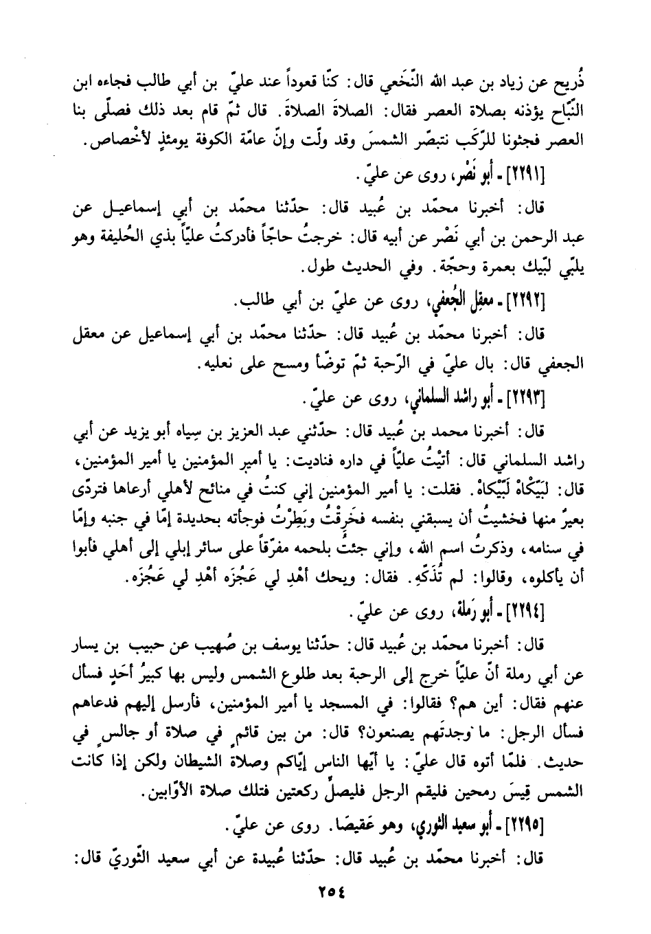 قَالَ: أَخْبَرَنَا مُحَمَّدُ بْنُ عُبَيْدٍ قَالَ: حَدَّثَنَا يُوسُفُ بْنُ صُهَيْبٍ عَنْ حَبِيبِ بْنِ يَسَارٍ عَنْ أَبِي رَمْلَةَ أَنَّ عَلِيًّا خَرَجَ إِلَى الرَّحَبَةِ بَعْدَ طُلُوعِ الشَّمْسِ وَلَيْسَ بِهَا كَبِيرُ أَحَدٍ فَسَأَلَ عَنْهُمْ فَقَالَ: أَيْنَ هُمْ؟ فَقَالُوا: فِي الْمَسْجِدِ يَا أَمِيرَ الْمُؤْمِنِينَ. فَأَرْسَلَ إِلَيْهِمْ فَدَعَاهُمْ فَسَأَلَ الرَّجُلَ: مَا وَجَدْتَهُمْ يَصْنَعُونَ؟ قَالَ: مِنْ بَيْنِ قَائِمٍ فِي صَلاةٍ أَوْ جَالِسٍ فِي حَدِيثٍ. فَلَمَّا أَتَوْهُ قَالَ [عَلِيٌّ: يَا أَيُّهَا النَّاسُ إِيَّاكُمْ وَصَلاةَ الشَّيْطَانِ وَلَكِنْ إِذَا كَانَتِ الشَّمْسُ قِيسَ رُمْحَيْنِ فَلْيَقُمِ الرَّجُلِ فَلْيُصَلِّ رَكْعَتَيْنِ فَتِلْكَ صَلاةُ الأَوَّابِينَ.]