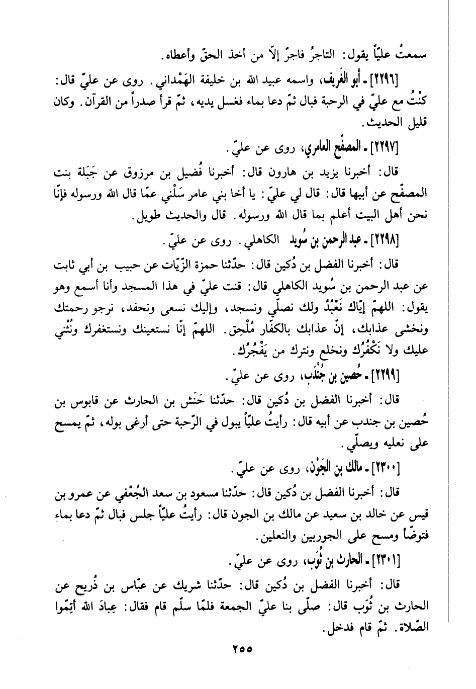 قَالَ: أَخْبَرَنَا الْفَضْلُ بْنُ دُكَيْنٍ قَالَ: حَدَّثَنَا حَنَشُ بْنُ الْحَارِثِ عَنْ قَابُوسَ بْنِ حُصَيْنِ بْنِ جُنْدُبٍ عَنْ أَبِيهِ قَالَ: رَأَيْتُ عَلِيًّا يَبُولُ فِي الرَّحَبَةِ حَتَّى أَرْغَى بَوْلُهُ. ثُمَّ يَمْسَحُ عَلَى نَعْلَيْهِ وَيُصَلِّي.