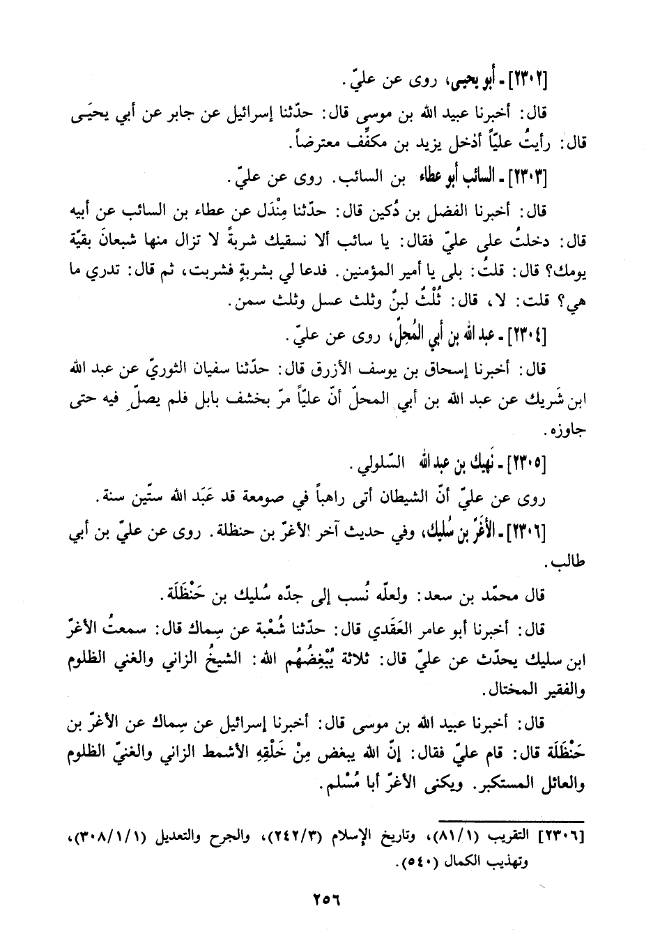 قَالَ: أَخْبَرَنَا عُبَيْدُ اللَّهِ بْنُ مُوسَى قَالَ: أَخْبَرَنَا إِسْرَائِيلُ عَنْ سِمَاكٍ عَنِ الأَغَرِّ بْنِ حَنْظَلَةَ قَالَ: [قَامَ عَلِيٌّ فَقَالَ: إِنَّ اللَّهَ يُبْغِضُ مِنْ خَلْقِهِ الأَشْمَطَ الزَّانِي وَالْغَنِيَّ الظَّلُومَ والعائل المستكبر. ويكنى الأغر أبا مسلم] .