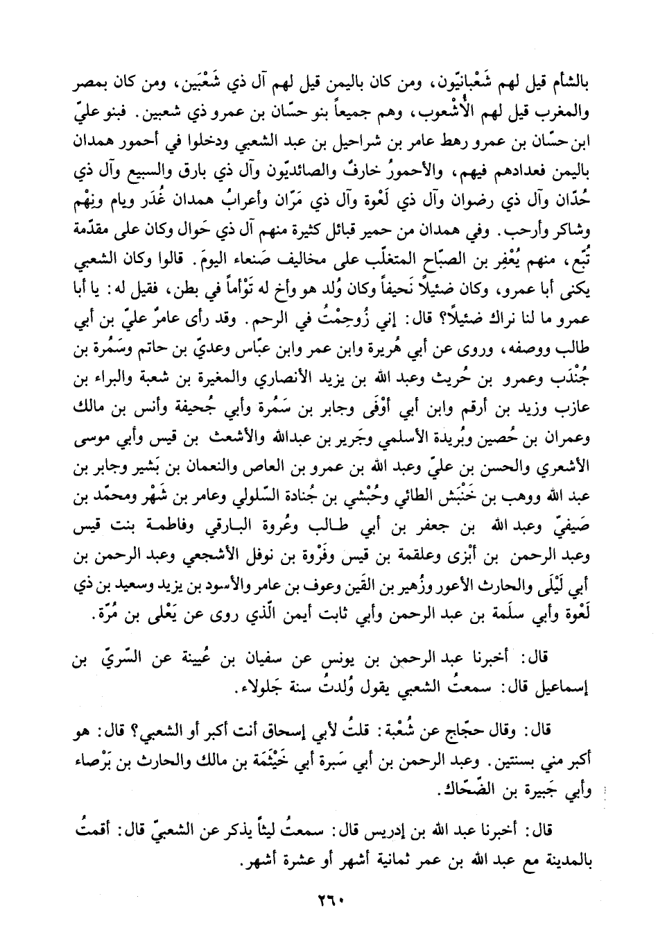 بِالشَّامِ قِيلَ لَهُمْ شَعْبَانِيُّونَ. وَمَنْ كَانَ بِالْيَمَنِ قِيلَ لَهُمْ آلُ ذِي شَعْبَيْنِ. وَمَنْ كَانَ بِمِصْرَ وَالْمَغْرِبِ قِيلَ لَهُمُ الأُشْعُوبُ. وَهُمْ جَمِيعًا بَنُو حَسَّانَ بْنِ عَمْرٍو ذِي شَعْبَيْنِ. فَبَنُو علي ابن حَسَّانَ بْنِ عَمْرٍو رَهْطُ عَامِرِ بْنِ شَرَاحِيلَ بْنِ عَبْدٍ الشَّعْبِيِّ وَدَخَلُوا فِي أُحْمُورِ هَمْدَانَ بِالْيَمَنِ فَعِدَادُهُمْ فِيهِمْ. وَالأَحْمُورُ خَارِفٌ وَالصَّائِدِيُّونَ وَآلُ ذِي بَارِقٍ وَالسَّبِيعُ وَآلُ ذِي حُدَّانَ وَآلُ ذِي رِضْوَانَ وَآلُ ذِي لَعْوَةَ وَآلُ ذِي مَرَّانَ وَأَعْرَابُ هَمْدَانَ غُدَرُ وَيَامُ وَنِهْمُ وَشَاكِرٌ وَأَرْحَبُ. وَفِي هَمْدَانَ مِنْ حِمْيَرَ قَبَائِلُ كَثِيرَةٌ مِنْهُمْ آلُ ذِي حَوَالٍ وَكَانَ عَلَى مُقَدَّمَةِ تُبَّعٍ. مِنْهُمْ يُعْفِرُ بْنُ الصَّبَّاحِ الْمُتَغَلِّبُ عَلَى مَخَالِيفِ صَنْعَاءَ الْيَوْمَ. قَالُوا وَكَانَ الشَّعْبِيُّ يُكْنَى أَبَا عَمْرٍو. وَكَانَ ضَئِيلا نَحِيفًا وَكَانَ وُلِدَ هو وأخ له توأما فِي بَطْنٍ. فَقِيلَ لَهُ: يَا أَبَا عَمْرٍو مَا لَنَا نَرَاكَ ضَئِيلا؟ قَالَ: إِنِّي زُوحِمْتُ فِي الرَّحِمِ. وَقَدْ رَأَى عَامِرٌ عَلِيَّ بْنَ أَبِي طَالِبٍ وَوَصَفَهُ. وَرَوَى عَنْ أَبِي هُرَيْرَةَ وَابْنِ عُمَرَ وَابْنِ عَبَّاسٍ وَعَدِيِّ بْنِ حَاتِمٍ وَسَمُرَةَ بْنِ جُنْدُبٍ وَعَمْرِو بْنِ حُرَيْثٍ وَعَبْدِ اللَّهِ بْنِ يَزِيدَ الأَنْصَارِيِّ وَالْمُغِيرَةِ بْنِ شُعْبَةَ وَالْبَرَاءِ بْنِ عَازِبٍ وَزَيْدِ بْنِ أَرْقَمَ وَابْنِ أَبِي أَوْفَى وَجَابِرِ بْنِ سَمُرَةَ وَأَبِي جُحَيْفَةَ وَأَنَسِ بْنِ مَالِكٍ وَعِمْرَانَ بْنِ حُصَيْنٍ وَبُرَيْدَةَ الأَسْلَمِيِّ وَجَرِيرِ بْنِ عَبْدِ اللَّهِ وَالأَشْعَثِ بْنِ قَيْسٍ وَأَبِي مُوسَى الأَشْعَرِيِّ وَالْحَسَنِ بْنِ عَلِيٍّ وَعَبْدِ اللَّهِ بْنِ عَمْرِو بْنِ الْعَاصِ وَالنُّعْمَانِ بْنِ بَشِيرٍ وَجَابِرِ بْنِ عَبْدِ اللَّهِ وَوَهْبِ بْنِ خَنْبَشٍ الطَّائِيِّ وَحُبْشِيِّ بْنِ جُنَادَةَ السَّلُولِيِّ وَعَامِرِ بْنِ شَهْرٍ وَمُحَمَّدِ بْنِ صَيْفِيٍّ وَعَبْدِ اللَّهِ بْنِ جَعْفَرِ بْنِ أَبِي طَالِبٍ وَعُرْوَةَ الْبَارِقِيِّ وَفَاطِمَةَ بِنْتِ قَيْسٍ وَعَبْدِ الرَّحْمَنِ بْنِ أَبْزَى وَعَلْقَمَةَ بْنِ قَيْسٍ وَفَرْوَةَ بْنِ نَوْفَلٍ الأَشْجَعِيِّ وَعَبْدِ الرَّحْمَنِ بْنِ أَبِي لَيْلَى وَالْحَارِثِ الأَعْوَرِ وَزُهَيْرِ بْنِ الْقَيْنِ وَعَوْفِ بْنِ عَامِرٍ وَالأَسْوَدِ بْنِ يَزِيدَ وَسَعِيدِ بْنِ ذِي لَعْوَةَ وَأَبِي سَلَمَةَ بْنِ عَبْدِ الرَّحْمَنِ وَأَبِي ثَابِتٍ أَيْمَنَ الَّذِي رَوَى عَنْ يَعْلَى بْنِ مُرَّةَ.