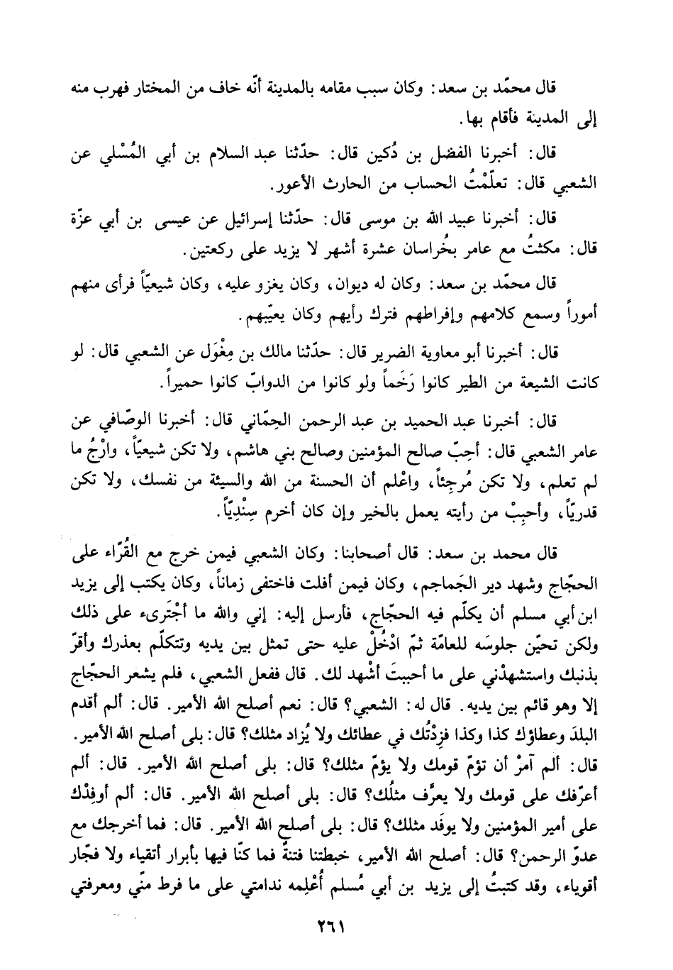 قَالَ: أَخْبَرَنَا عَبْدُ الْحَمِيدِ بْنُ عَبْدِ الرَّحْمَنِ الْحِمَّانِيُّ قَالَ: أَخْبَرَنَا الْوَصَّافِيُّ عَنْ عَامِرٍ الشَّعْبِيِّ قَالَ: أَحِبَّ صَالِحَ الْمُؤْمِنِينَ وَصَالِحَ بَنِي هَاشِمٍ. وَلا تَكُنْ شِيعَيًّا. وَارْجُ مَا لَمْ تَعْلَمْ. وَلا تَكُنْ مُرْجِئًا. وَاعْلَمْ أَنَّ الْحَسَنَةَ مِنَ اللَّهِ وَالسَّيِّئَةَ مِنْ نَفْسِكِ. وَلا تَكُنْ قَدَرِيًّا. وَأَحْبِبْ مَنْ رَأَيْتَهُ يَعْمَلُ بِالْخَيْرِ وَإِنْ كَانَ أَخْرَمَ سِنْدِيًّا.