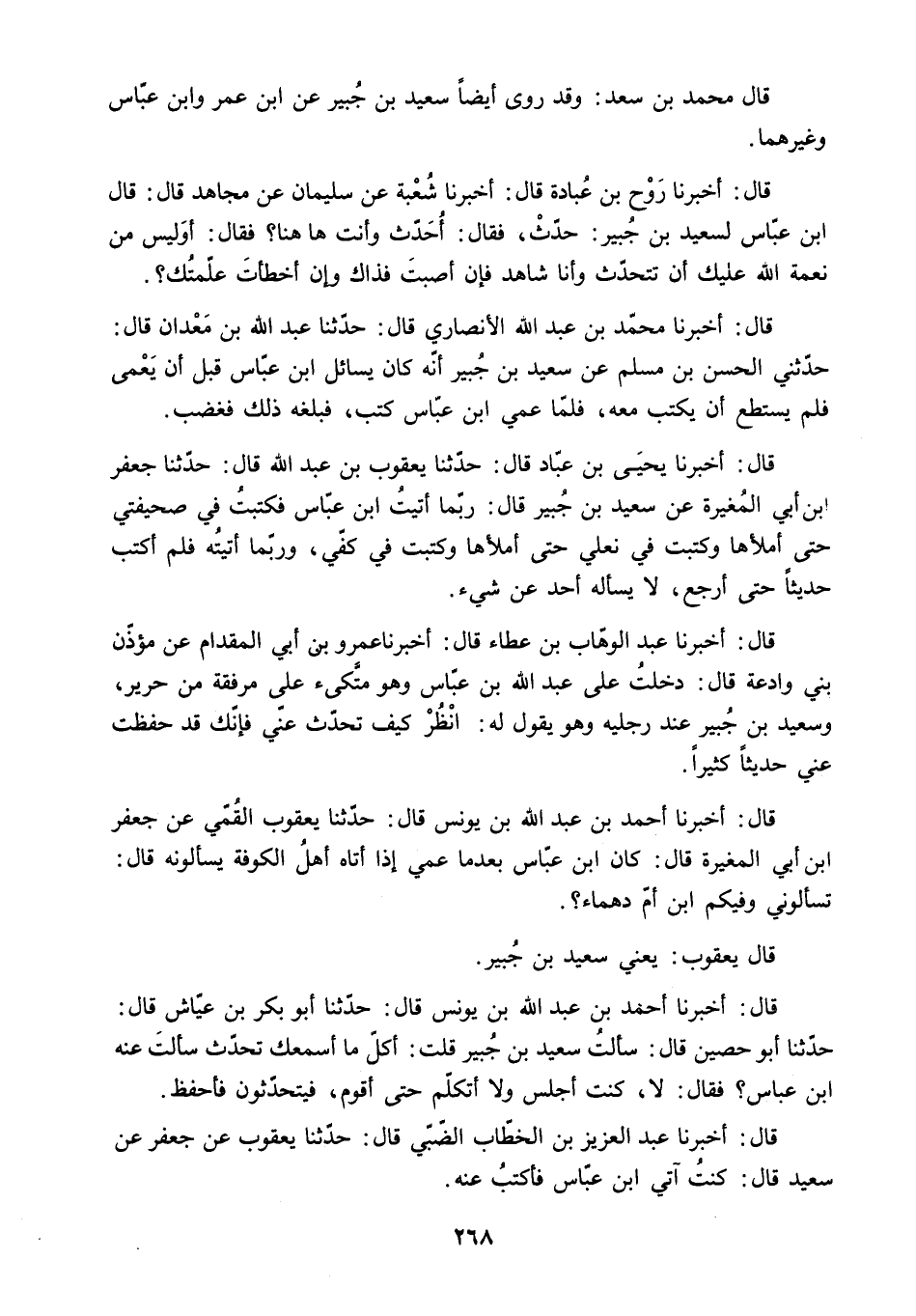 قَالَ: أَخْبَرَنَا يَحْيَى بْنُ عَبَّادٍ قَالَ: حَدَّثَنَا يَعْقُوبُ بْنُ عَبْدِ اللَّهِ قَالَ: حَدَّثَنَا جَعْفَرُ ابْنَ أَبِي الْمُغِيرَةِ عَنْ سَعِيدِ بْنِ جُبَيْرٍ قَالَ: رُبَّمَا أَتَيْتُ ابْنَ عَبَّاسٍ فَكَتَبْتُ فِي صَحِيفَتِي حَتَّى أَمْلأَهَا وَكَتَبْتُ فِي نَعْلِي حَتَّى أَمْلأَهَا وَكَتَبْتُ فِي كَفِّي. وَرُبَّمَا أَتَيْتُهُ فَلَمْ أَكْتُبْ حَدِيثًا حَتَّى أَرْجِعَ. لا يَسْأَلُهُ أَحَدٌ عَنْ شيء.