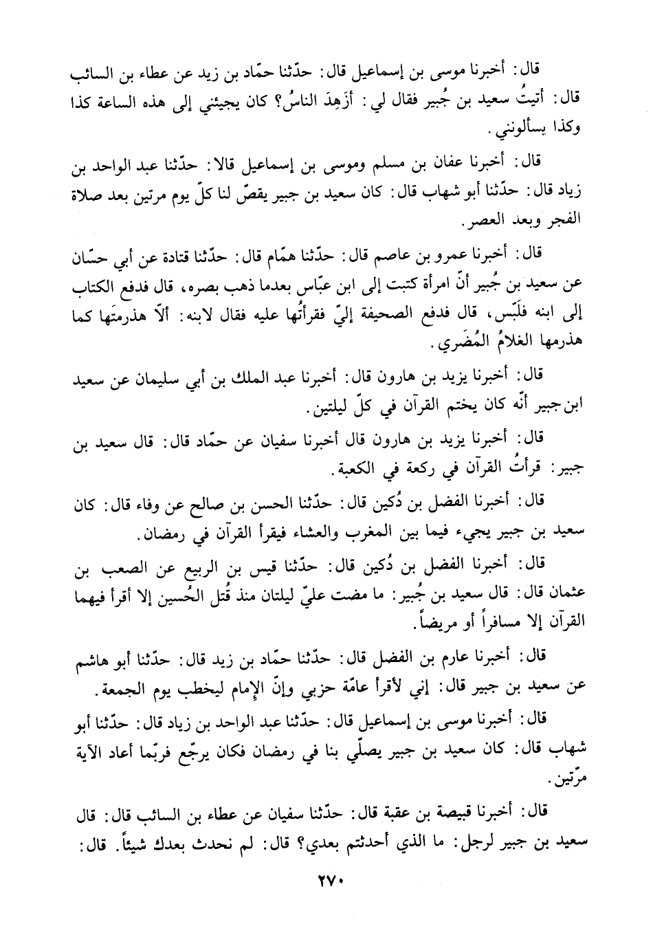 قَالَ: أَخْبَرَنَا يَزِيدُ بْنُ هَارُونَ قَالَ أَخْبَرَنَا سُفْيَانُ عَنْ حَمَّادٍ قَالَ: قَالَ سَعِيدُ بْنُ جُبَيْرٍ: قَرَأْتُ الْقُرْآنَ فِي رَكْعَةٍ فِي الْكَعْبَةِ.