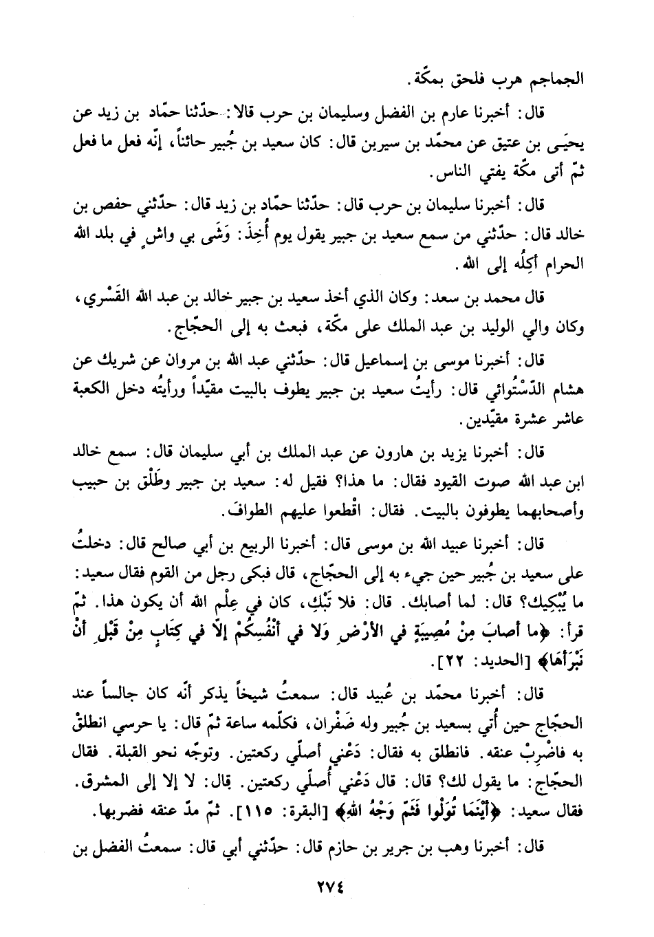 قال: أَخْبَرَنَا مُحَمَّدُ بْنُ عُبَيْدٍ قَالَ: سَمِعْتُ شَيْخًا يَذْكُرُ أَنَّهُ كَانَ جَالِسًا عِنْدَ الْحَجَّاجِ حِينَ أُتِيَ بِسَعِيدِ بْنِ جُبَيْرٍ وَلَهُ ضَفْرَانِ. فَكَلَّمَهُ سَاعَةً ثُمَّ قَالَ: يَا حَرَسِيُّ انْطَلِقْ بِهِ فَاضْرِبْ عُنُقَهُ. فَانْطَلَقَ بِهِ فَقَالَ: دَعْنِي أُصَلِّي رَكْعَتَيْنِ. وَتَوَجَّهْ نَحْوَ الْقِبْلَةِ. فَقَالَ الْحَجَّاجُ: مَا يَقُولُ لَكَ؟ قَالَ: قَالَ دَعْنِي أُصَلِّي رَكْعَتَيْنِ. قَالَ: لا إِلا إِلَى الْمَشْرِقِ.