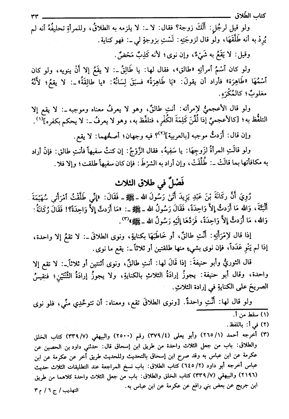 إذا قال لامرأته: أنت طالق، أو خاطبها بكناية، ونوى الطلاق-: لا تقع إلا واحدة، إذا لم ينو عدداً، فإن نوى بشيء منها طلقتين أو ثلاثاً-: يقع ما نوى.
