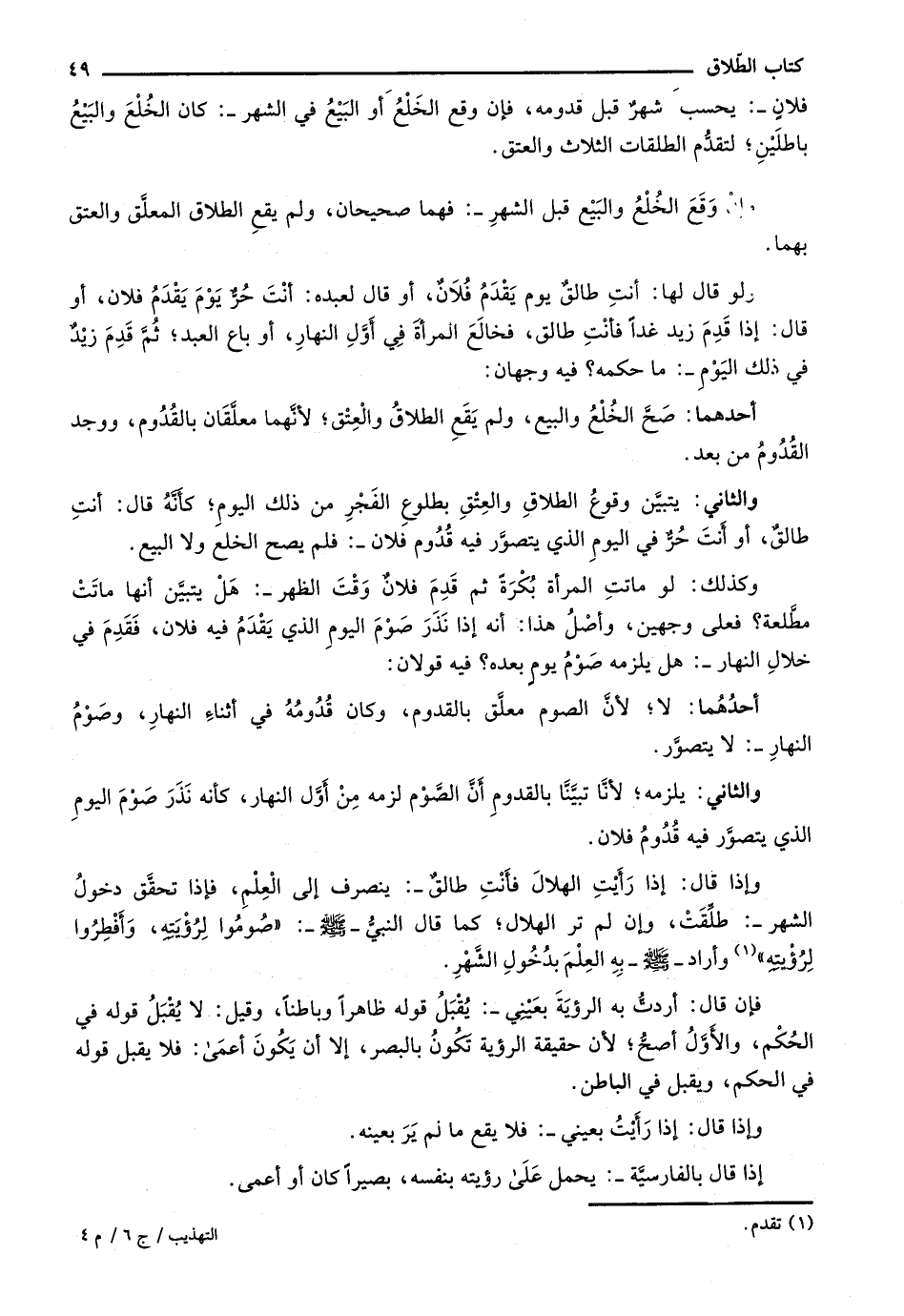 وإذا قال: إذا رأيت الهلال فأنت طالق-: ينصرف إلى العلم، فإذا تحقق دخول الشهر-: طلقت، وإن لم تر الهلال؛ كما قال النبي صلى الله عليه وسلم: "صُومُوا لِرُؤْيَتِهِ، وَأَفْطِرُوا لِرُؤْيتِهِ" وأراد - صلى الله عليه وسلم- به العلم بدخول الشهر.