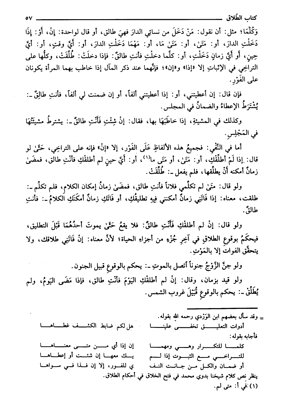 وكلما؛ مثل: أن نقول: من دخل من نسائي الدار فهي طالق، أو قال لواحدة: إن، أو: إذا دخلت الدار، أو: متى، أو: متى ما، أو: مهما دخلت الدار، أو: أي وقت، أو: أي حين، أو أي زمان دخلت، أو: كلما دخلت فأنت طالق: فإذا دخلت: طلقت، وكلها على التراخي في الإثبات إلا "إذا" و"إن"؛ فإنهما عند ذكر المآل إذا خاطب بهما المرأة يكونان على الفور.