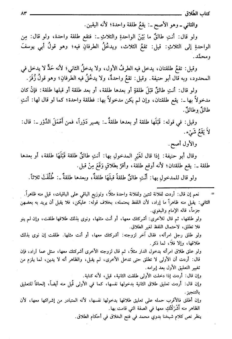 ولو قال: أنت طالق ما بين الواحدة والثلاث-: فتقع طلقة واحدة، ولو قال: من الواحدة إلى الثلاث: قيل: تقع الثلاث، ويدخل الطرفان فيه؛ وهو قول أبي يوسف ومحمد.