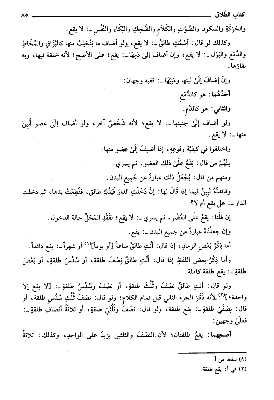 وكذلك لو قال اسمك طالق-: لا يقع، ولو أضاف ما ينحلب منها كالبراق والمخاط والدمع والبول-: لا يقع، وإن أضاف إلى دمها-: يقع؛ على الأصح؛ لأنه خلقة فيها وبه بقاؤها.