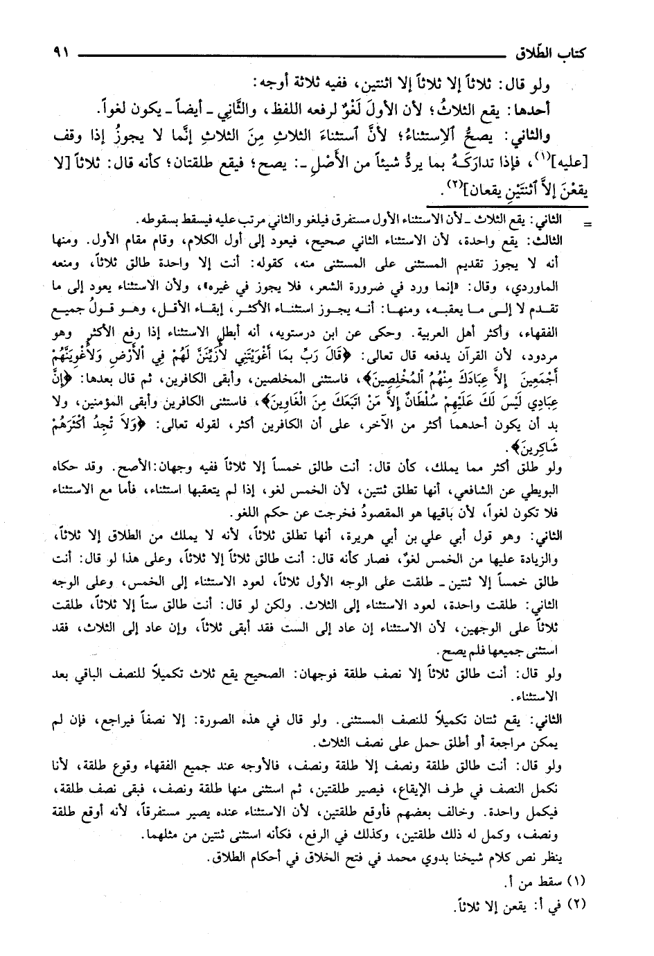 والثاني: يصح الاستثناء؛ لأن الاستثناء الثلاث من الثلاث إنما لا يجوز إذا وقف [عليه]، فإذا تداركه بما يرد شيئاً من الأصل-: يصح؛ فيقع طلقتان؛ كأنه قال: ثلاثاً [لا يقعن إلا اثنتين يقعان].