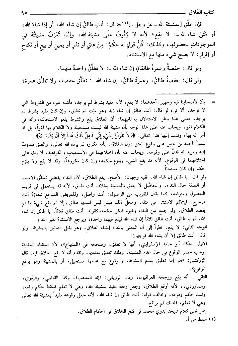 فإن علق [بمشيئة الله- عز وجل-] فقال أنت طالق إن شاء الله، أو إذا شاء الله، أو متى شاء الله-: لا يقع؛ لأنه لا وقوف على مشيئة الله، وإنما تعرف مشيئته في الموجودات بحصولها وكذلك: كل قول له حكم: من عتق أو نذر أو يمين أو بيع أو نكاح أو إقرار: لا يصح شيء منها مع الاستثناء.