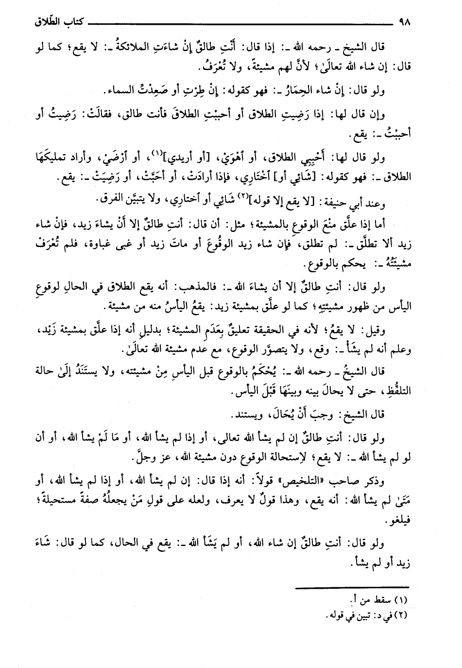 قال الشيخ - رحمه الله-: إذا قال: أنت طالق إن شاءت الملائكة-: لا يقع؛ كما لو قال: إن شاء الله تعالى؛ لأن لهم مشيئة، ولا تعرف.