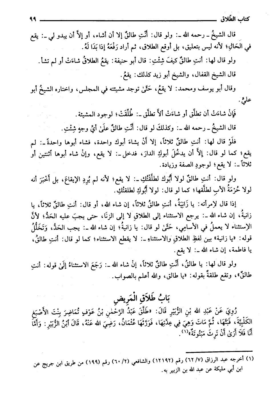 قال الشيخ- رحمه الله-: ولو قال أنت طالق إلا أن أشاء، أو إلا أن يبدو لي-: يقع في الال؛ لأنه ليس بتعليق، بل أوقع الطلاق، ثم أراد رفعه إذا بدا له.