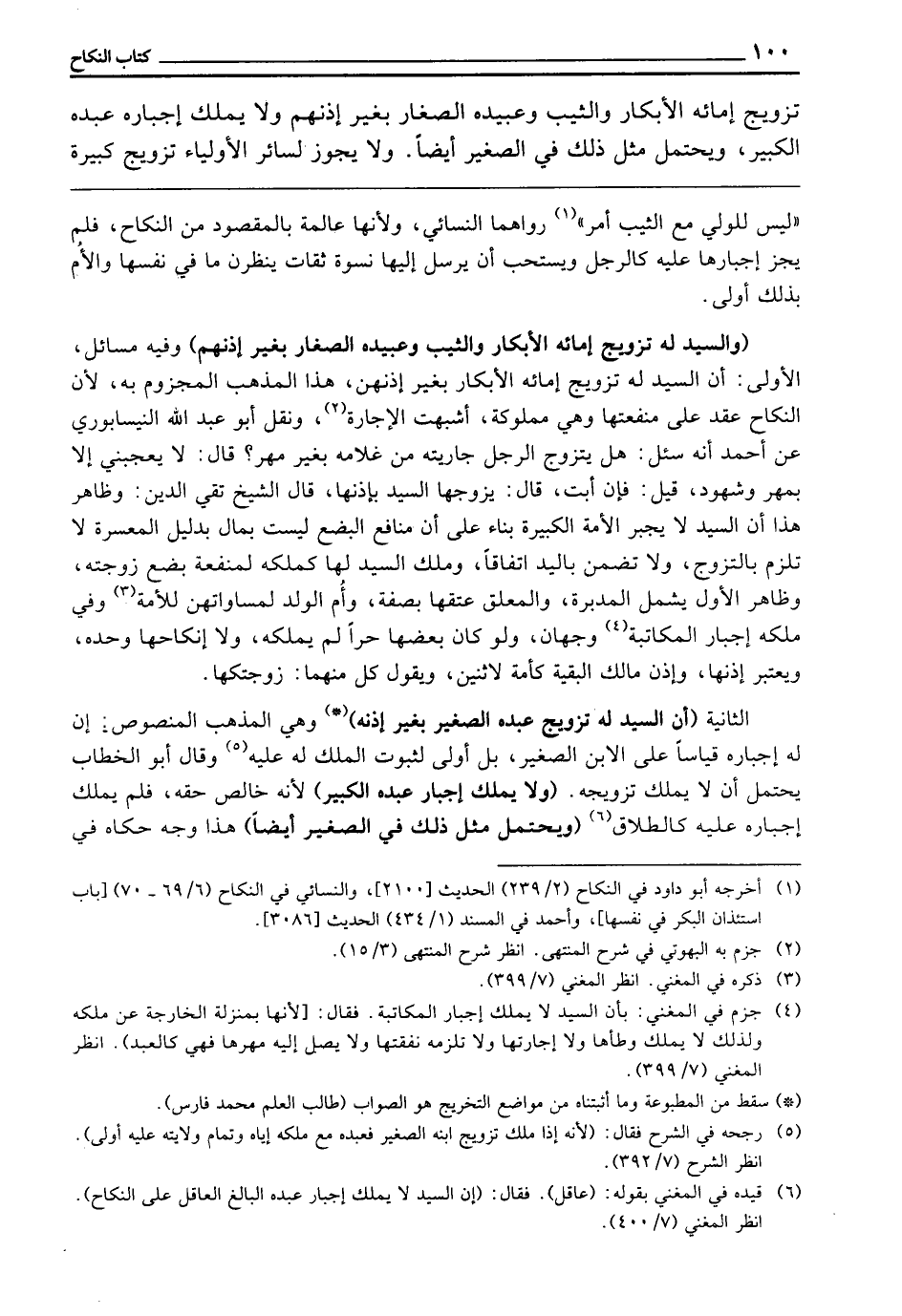 الثَّانِيَةُ (أن السيد له تزويج عبده الصغير بغير إذنه) وَهِيَ الْمَذْهَبُ الْمَنْصُوصُ: إِنَّ لَهُ إِجْبَارَهُ قِيَاسًا عَلَى الِابْنِ الصَّغِيرِ، بَلْ أَوْلَى ; لِثُبُوتِ الْمِلْكِ لَهُ عَلَيْهِ، وقال أبو الخطاب: يحتمل أن لا يملك تزويجه. (وَلَا يَمْلِكُ إِجْبَارَ عَبْدِهِ الْكَبِيرِ) ; لِأَنَّهُ خَالِصُ حَقِّهِ، فَلَمْ يَمْلِكْ إِجْبَارَهُ عَلَيْهِ كَالطَّلَاقِ (وَيُحْتَمَلُ مِثْلُ ذَلِكَ فِي الصَّغِيرِ أَيْضًا) هَذَا وَجْهٌ حَكَاهُ فِي