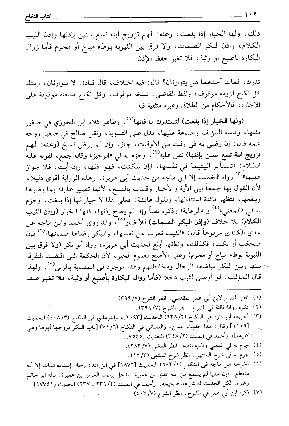 (وَلَهَا الْخِيَارُ إِذَا بَلَغَتْ) ; لِتَسْتَدْرِكَ مَا فَاتَهَا، وَظَاهِرُ كَلَامِ ابْنِ الْجَوْزِيِّ فِي صَغِيرٍ مِثْلِهَا، وَقَاسَهُ الْمُؤَلِّفُ وَجَمَاعَةٌ عَلَيْهَا، فَدَلَّ عَلَى التَّسْوِيَةِ، وَنَقَلَ صَالِحٌ فِي صَغِيرٍ زَوَّجَهُ عَمُّهُ، قَالَ: إِنْ رَضِيَ بِهِ فِي وَقْتٍ مِنَ الْأَوْقَاتِ جَازَ، وَإِنْ لَمْ يَرْضَ فُسِخَ، (وَعَنْهُ: لَهُمْ تَزْوِيجُ ابْنَةِ تِسْعِ سِنِينَ بِإِذْنِهَا) نَصَّ عَلَيْهِ، وَجَزَمَ بِهِ فِي " الْوَجِيزِ "، وَقَالَهُ جَمْعٌ ; لِقَوْلِهِ - عَلَيْهِ السَّلَامُ -: «تُسْتَأْمَرُ الْيَتِيمَةُ فِي نَفْسِهَا، فَإِنْ سَكَتَتْ فَهُوَ إِذْنُهَا، وَإِنْ أَبَتْ فَلَا جَوَازَ عَلَيْهَا» رَوَاهُ الْخَمْسَةُ إِلَّا ابْنَ مَاجَهْ، مِنْ حَدِيثِ أَبِي هُرَيْرَةَ، وَهَذِهِ الرِّوَايَةُ أَقْوَى دَلِيلًا ; لِأَنَّ الْقَوْلَ بِهَا جَمْعٌ بَيْنَ الْآيَةِ وَالْأَخْبَارِ وَقُيِّدَتْ بِالتِّسْعِ ; لِأَنَّهَا تَصِيرُ عَارِفَةً بِمَا يَضُرُّهَا وَيَنْفَعُهَا، فَتَظْهَرُ فَائِدَةُ اسْتِئْذَانِهَا ; وَلِقَوْلِ عَائِشَةَ: فَعَلَى هَذَا لَا خِيَارَ لَهَا إِذَا بَلَغَتْ، وَجَزَمَ بِهِ فِي " الْمُغْنِي " و" الرِّعَايَةِ "، وَذَكَرَهُ نصا، وَإِنْ لَمْ يَصِحَّ إِذْنُهَا، فَلَهَا الْخِيَارُ، (وَإِذْنُ الثَّيِّبِ الْكَلَامُ) بِلَا خِلَافٍ (وَإِذْنُ الْبِكْرِ الصُّمَاتُ) ; لِلْأَخْبَارِ، وَقَدْ رَوَى أَحْمَدُ، وَابْنُ مَاجَهْ، عَنْ عَدِيٍّ الْكِنْدِيِّ مَرْفُوعًا، قَالَ: «الثَّيِّبُ تُعْرِبُ عَنْ نَفْسِهَا، وَالْبِكْرُ رِضَاهَا صُمَاتُهَا فَإِنْ ضَحِكَتْ أَوْ بَكَتْ فَكَذَلِكَ، وَنُطْقُهَا أَبْلَغُ ;» لِحَدِيثِ أَبِي هُرَيْرَةَ، رَوَاهُ أَبُو بَكْرٍ (وَلَا فَرْقَ بَيْنَ الثُّيُوبَةِ بِوَطْءٍ مُبَاحٍ أَوْ مُحَرَّمٍ) وَعَلَى الْأَصَحِّ ; لِعُمُومِ الْخَبَرِ ; لِأَنَّ الْحِكْمَةَ الَّتِي اقْتَضَتِ التَّفْرِقَةَ بَيْنَهَا وَبَيْنَ الْبِكْرِ - مُبَاضَعَةُ الرِّجَالِ وَمُخَالَطَتُهُمْ، وَهَذَا مَوْجُودٌ فِي الْمُصَابَةِ بِالزِّنَا ; وَلِهَذَا قَالَ الْمُؤَلِّفُ: لَوْ أَوْصَى لِثَيِّبٍ دَخَلَا (فَأَمَّا زَوَالُ الْبَكَارَةِ بِأُصْبُعٍ أَوْ وَثْبَةٍ فَلَا تُغَيِّرُ صِفَةَ