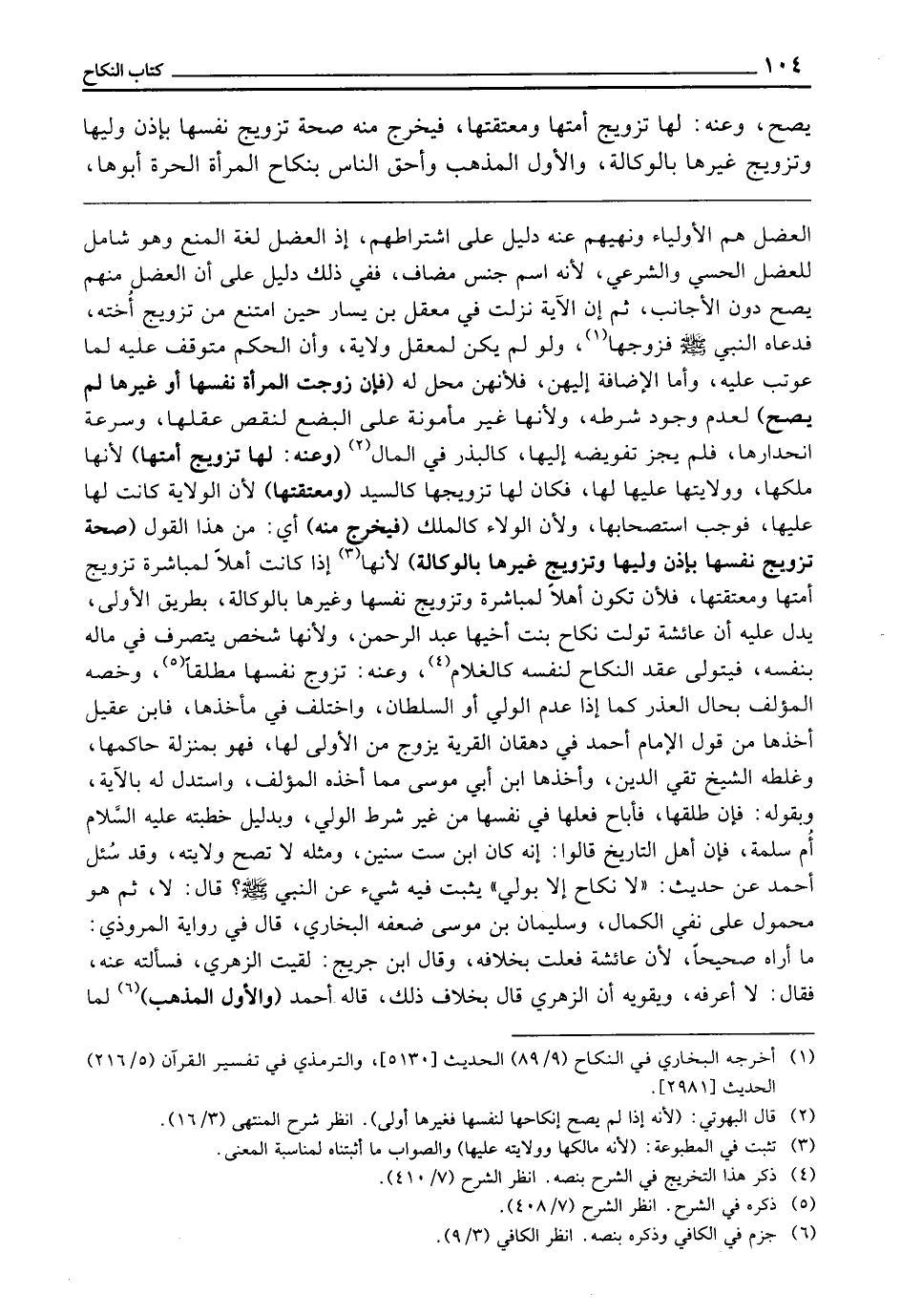 ـــــــــــــــــــــــــــــQالْعَضْلِ هُمُ الْأَوْلِيَاءُ، وَنَهْيُهُمْ عَنْهُ دَلِيلٌ عَلَى اشْتِرَاطِهِمْ ; إِذِ الْعَضْلُ لُغَةً: الْمَنْعُ، وَهُوَ شَامِلٌ لِلْعَضْلِ الْحِسِّيِّ وَالشَّرْعِيِّ ; لِأَنَّهُ اسْمُ جِنْسٍ مُضَافٍ، فَفِي ذَلِكَ دَلِيلٌ عَلَى أَنَّ الْعَضْلَ مِنْهُمْ يَصِحُّ دُونَ الْأَجَانِبِ، ثُمَّ إِنَّ الْآيَةَ نَزَلَتْ فِي مَعْقِلِ بْنِ يَسَارٍ حِينَ امْتَنَعَ مِنْ تَزْوِيجِ أُخْتِهِ، فَدَعَاهُ النَّبِيُّ - صَلَّى اللَّهُ عَلَيْهِ وَسَلَّمَ - فَزَوَّجَهَا وَلَوْ لَمْ يَكُنْ لِمَعْقِلٍ وِلَايَةٌ، وَأنَّ الْحُكْمَ مُتَوَقِّفٌ عَلَيْهِ لَما عُوتِبَ عَلَيْهِ، وَأَمَّا الْإِضَافَةُ إِلَيْهِنَّ ; فَلِأَنَّهُنَّ مَحَلٌّ لَهُ (فَإِنْ زَوَّجَتِ الْمَرْأَةُ نَفْسَهَا أَوْ غَيْرَهَا، لَمْ يَصِحَّ) ; لِعَدَمِ وُجُودِ شَرْطِهِ ; وَلِأَنَّهَا غَيْرُ مَأْمُونَةٍ عَلَى الْبُضْعِ ; لِنَقْصِ عَقْلِهَا، وَسُرْعَةِ انْحِدَارِهَا، فَلَمْ يَجُزْ تَفْوِيضُهُ إِلَيْهَا كَالْبَذْرِ فِي الْمَالِ (وَعَنْهُ: لَهَا تَزْوِيجُ أَمَتِهَا) ; لِأَنَّهَا ملكُهَا، وَوِلَايَتُهَا عَلَيْهَا لَهَا، فَكَانَ لَهَا تَزْوِيجُهَا كَالسَّيِّدِ (وَمُعْتَقَتِهَا) ; لِأَنَّ الْوِلَايَةَ كَانَتْ لَهَا عَلَيْهَا، فَوَجَبَ اسْتِصْحَابُهَا ; وَلِأَنَّ الْوَلَاءَ كَالْمِلْكِ، (فَيَخْرُجُ مِنْهُ) أَيْ: مِنْ هَذَا الْقَوْلِ (صِحَّةُ تَزْوِيجِ نَفْسِهَا بِإِذْنِ وَلَيِّهَا، وَتَزْوِيجُ غَيْرِهَا بِالْوِكَالَةِ) ; لِأَنَّهَا إِذَا كَانَتْ أَهْلًا لِمُبَاشَرَةِ تَزْوِيجِ أَمَتِهَا وَمُعْتَقَتِهَا، فَلِأَنْ تَكُونَ أَهْلًا لِمُبَاشَرَةِ وَتَزْوِيجِ نَفْسِهَا وَغَيْرِهَا بِالْوِكَالَةِ بِطَرِيقِ الْأَوْلَى، يَدُلُّ عَلَيْهِ أَنَّ عَائِشَةَ تَوَلَّتْ نِكَاحَ بِنْتِ أَخِيهَا عَبْدِ الرَّحْمَنِ ; وَلِأَنَّهَا شَخْصٌ يَتَصَرَّفُ فِي مَالِهِ بِنَفْسِهِ، فَيَتَوَلَّى عَقْدَ النِّكَاحِ لِنَفْسِهِ كَالْغُلَامِ، وَعَنْهُ: تُزَوِّجُ نَفْسَهَا مُطْلَقًا، وَخَصَّهُ الْمُؤَلِّفُ بِحَالِ الْعُذْرِ كَمَا إِذَا عُدِمَ الْوَلِيُّ أَوِ السُّلْطَانُ، وَاخْتُلِفَ فِي مَأْخَذِهَا، فَابْنُ عَقِيلٍ أَخَذَهَا مِنْ قَوْلِ الْإِمَامِ أَحْمَدَ فِي دِهْقَانِ الْقَرْيَةِ يُزَوِّجُ مَنِ الْأَوْلَى لَهَا، فَهُوَ بِمَنْزِلَةِ حَاكِمِهَا، وَغَلَّطَهُ الشَّيْخُ تَقِيُّ الدِّينِ، وَأَخَذَهَا ابْنُ أَبِي مُوسَى مِمَّا أَخَذَهُ الْمُؤَلِّفُ، وَاسْتَدَلَّ لَهُ بِالْآيَةِ، وَبِقَوْلِهِ: فَإِنْ طَلَّقَهَا، فَأَبَاحَ فِعْلَهَا فِي نَفْسِهَا مِنْ غَيْرِ شَرْطِ الْوَلِيِّ ; وَبِدَلِيلِ خِطْبَتِهِ - عَلَيْهِ السَّلَامُ - أُمَّ سَلَمَةَ، فَإِنَّ أَهْلَ التَّارِيخِ قَالُوا: إِنَّهُ كَانَ ابْنَ سِتِّ سِنِينَ، وَمِثْلُهُ لَا تَصِحُّ وِلَايَتُهُ، وَقَدْ سُئِلَ أَحْمَدُ عَنْ حَدِيثِ: «لَا نِكَاحَ إِلَّا بِوَلِيٍّ» يَثْبُتُ فِيهِ شَيْءٌ عَنِ النَّبِيِّ - صَلَّى اللَّهُ عَلَيْهِ وَسَلَّمَ - قَالَ: لَا، ثُمَّ هُوَ مَحْمُولٌ عَلَى نَفْيِ الْكَمَالِ، وَسُلَيْمَانُ بْنُ مُوسَى ضَعَّفَهُ الْبُخَارِيُّ، قَالَ فِي رِوَايَةِ الْمَرْوَذِيِّ: مَا أَرَاهُ صَحِيحًا ; لِأَنَّ عَائِشَةَ فَعَلَتْ بِخِلَافِهِ، وَقَالَ ابْنُ جُرَيْجٍ: لَقِيتُ الزُّهْرِيَّ، فَسَأَلْتُهُ عَنْهُ، فَقَالَ: لَا أَعْرِفُهُ، وَيُقَوِّيهِ أَنَّ الزُّهْرِيَّ قَالَ بِخِلَافِ ذَلِكَ، قَالَهُ أَحْمَدُ، (وَالْأَوَّلُ الْمَذْهَبُ) ; لِمَا