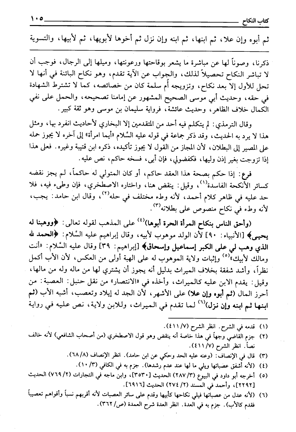 (وَأَحَقُّ النَّاسِ بِنِكَاحِ الْمَرْأَةِ الْحُرَّةِ أَبُوهَا) عَلَى الْمَذْهَبِ ; لِقَوْلِهِ تَعَالَى {وَوَهَبْنَا لَهُ يَحْيَى} [الأنبياء: 90] ; لِأَنَّ الْوَلَدَ مَوْهُوبٌ لِأَبِيهِ، وَقَالَ إِبْرَاهِيمُ - عَلَيْهِ السَّلَامُ - {الْحَمْدُ لِلَّهِ الَّذِي وَهَبَ لِي عَلَى الْكِبَرِ إِسْمَاعِيلَ وَإِسْحَاقَ} [إبراهيم: 39] ، وَقَالَ - عَلَيْهِ السَّلَامُ -: «أَنْتَ وَمَالُكَ لِأَبِيكَ» وَإِثْبَاتُ وِلَايَةِ الْمَوْهُوبِ لَهُ عَلَى الْهِبَةِ أَوْلَى مِنَ الْعَكْسِ ; لِأَنَّ الْأَبَ أَكْمَلُ نَظَرًا، وَأَشَدُّ شَفَقَةً، بِخِلَافِ الْمِيرَاثِ ; بِدَلِيلِ أَنَّهُ يَجُوزُ أَنْ يَشْتَرِيَ لَهَا مِنْ مَالِهِ وَلَهُ مِنْ مَالِهَا، وَقِيلَ: يُقَدَّمُ الِابْنُ عَلَيْهِ كَالْمِيرَاثِ، وَأَخَذَهُ فِي " الِانْتِصَارِ " مِنْ نَقْلِ حَنْبَلٍ: الْعُصْبَةُ: مَنْ أَحْرَزَ الْمَالَ (ثُمَّ أَبُوهُ، وَإِنْ عَلَا) عَلَى الْأَشْهَرِ ; لِأَنَّ الْجَدَّ لَهُ إِيلَادٌ وَتَعَصُّبٌ، أَشْبَهَ الْأَبَ (ثُمَّ ابْنُهَا، ثُمَّ ابْنُهُ، وَإِنْ نَزَلَ) ; لِمَا تَقَدَّمَ فِي الْمِيرَاثِ، وَلِلِابْنِ وِلَايَةٌ، نَصَّ عَلَيْهِ فِي رِوَايَةِ