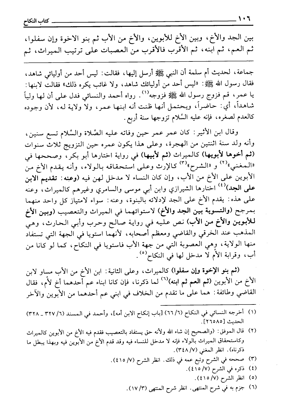 وَقَالَ ابْنُ الْأَثِيرِ: كَانَ عُمُرُ عُمَرَ حِينَ وَفَاتِهِ - عَلَيْهِ الصَّلَاةُ وَالسَّلَامُ - تِسْعَ سِنِينَ، وَأنَّهُ وُلِدَ سَنَةَ اثْنَتَيْنِ مِنَ الْهِجْرَةِ، وَعَلَى هَذَا يَكُونُ عُمُرُهُ حِينَ التَّزْوِيجِ ثَلَاثَ سَنَوَاتٍ (ثُمَّ أَخُوهَا لِأَبَوَيْهَا) كَالْمِيرَاثِ (ثُمَّ لِأَبِيهَا) فِي رِوَايَةٍ اخْتَارَهَا أَبُو بَكْرٍ، وَصَحَّحَهَا فِي " الْمُغْنِي " و" الشَّرْحِ " كَالْإِرْثِ وَعَلَى اسْتِحْقَاقِهِ بِالْوَلَاءِ، وَأَنَّهُ يُقَدَّمُ الْأَخُ مِنَ الْأَبَوَيْنِ عَلَى الْأَخِ مِنَ الْأَبِ، وَإِنْ كَانَ النِّسَاءُ لَا مَدْخَلَ لَهُنَّ فِيهِ (وَعَنْهُ: تَقْدِيمُ الِابْنِ عَلَى الْجَدِّ) اخْتَارَهَا الشِّيرَازِيُّ، وَابْنُ أَبِي مُوسَى، وَالسَّامَرِّيُّ، وَغَيْرُهُمْ كَالْمِيرَاثِ، وَعَنْهُ عَلَى هَذِهِ: يُقَدَّمُ الْأَخُ عَلَى الْجَدِّ ; لِإِدْلَائِهِ بِالْبُنُوَّةِ، وَعَنْهُ: سَوَاءٌ لِامْتِيَازِ كُلِّ وَاحِدٍ مِنْهُمَا بِمُرَجِّحٍ (وَالتَّسْوِيَةُ بَيْنَ الْجَدِّ وَالْأَخِ) ; لِاسْتِوَائِهِمَا فِي الْمِيرَاثِ وَالتَّعْصِيبِ (وَبَيْنَ الْأَخِ لِلْأَبَوَيْنِ وَالْأَخِ مِنَ الْأَبِ) نَصَّ عَلَيْهِ فِي رِوَايَةِ صَالِحٍ، وَحَرْبٍ، وَأَبِي الْحَارِثِ، وَهِيَ الْمَذْهَبُ عِنْدَ الْخِرَقِيِّ، وَالْقَاضِي، وَمُعْظَمِ أَصْحَابِهِ ; لِأَنَّهُمَا اسْتَوَيَا فِي الْجِهَةِ الَّتِي تُسْتَفَادُ مِنْهَا فِي الْوِلَايَةِ، وَهِيَ الْعُصُوبَةُ الَّتِي مِنْ جِهَةِ الْأَبِ، فَاسْتَوَيَا فِي النِّكَاحِ، كَمَا لَوْ كَانَا مِنْ أَبٍ، وَقَرَابَةُ الْأُمِّ لَا مَدْخَلَ لَهَا فِي النِّكَاحِ.