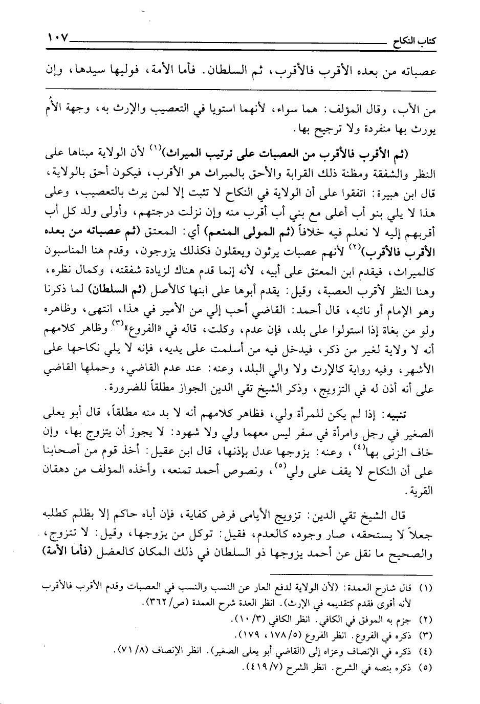 (ثُمَّ الأقرب فَالْأَقْرَبُ مِنَ الْعَصَبَاتِ عَلَى تَرْتِيبِ الْمِيرَاثِ) ; لِأَنَّ الْوِلَايَةَ مَبْنَاهَا عَلَى النَّظَرِ وَالشَّفَقَةِ، وَمَظِنَّةُ ذَلِكَ الْقَرَابَةُ، وَالْأَحَقُّ بِالْمِيرَاثِ هُوَ الْأَقْرَبُ، فَيَكُونُ أَحَقَّ بِالْوِلَايَةِ، قَالَ ابْنُ هُبَيْرَةَ: اتَّفَقُوا عَلَى أَنَّ الْوِلَايَةَ فِي النِّكَاحِ لَا تَثْبُتُ إِلَّا لِمَنْ يَرِثُ بِالتَّعْصِيبِ، وَعَلَى هَذَا لَا يَلِي بَنُو أَبٍ أَعْلَى مَعَ بَنِي أَبٍ أَقْرَبَ مِنْهُ وَإِنْ نَزَلَتْ دَرَجَتُهُمْ، وَأَوْلَى وَلَدِ كُلِّ أَبٍ أَقْرَبُهُمْ إِلَيْهِ، لَا نَعْلَمُ فِيهِ خِلَافًا (ثُمَّ الْمَوْلَى الْمُنْعِمُ) أَيِ: الْمُعْتِقُ (ثُمَّ عَصَبَاتُهُ مِنْ بَعْدِهِ الْأَقْرَبُ فَالْأَقْرَبُ) ; لِأَنَّهُمْ عَصَبَاتٌ، يَرِثُونَ وَيَعْقِلُونَ، فَكَذَلِكَ يُزَوِّجُونَ، وَقُدِّمَ هُنَا الْمُنَاسِبُونَ كَالْمِيرَاثِ، فَيُقَدَّمُ ابْنُ الْمُعْتِقِ عَلَى أَبِيهِ ; لِأَنَّهُ إِنَّمَا قُدِّمَ هُنَاكَ لِزِيَادَةِ شَفَقَتِهِ وَكَمَالِ نَظَرِهِ، وَهُنَا النَّظَرُ لِأَقْرَبِ الْعُصْبَةِ، وَقِيلَ: يُقَدَّمُ أَبُوهَا عَلَى ابْنِهَا كَالْأَصْلِ (ثُمَّ السُّلْطَانُ) ; لِمَا ذَكَرْنَا، وَهُوَ الْإِمَامُ أَوْ نَائِبُهُ، قَالَ أَحْمَدُ: الْقَاضِي أَحَبُّ إِلَيَّ مِنَ الْأَمِيرِ فِي هَذَا، انْتَهَى، وَظَاهِرُهُ وَلَوْ مِنْ بُغَاةٍ إِذَا اسْتَوْلَوْا عَلَى بَلَدٍ، فَإِنْ عُدِمَ، وَكَّلَتْ، قَالَهُ فِي " الْفُرُوعِ "، وَظَاهِرُ كَلَامِهِمْ أَنَّهُ لَا وِلَايَةَ لِغَيْرِ مَنْ ذَكَرَ، فَيَدْخُلُ فِيهِ مَنْ أَسْلَمَتْ عَلَى يَدَيْهِ، فَإِنَّهُ لَا يَلِي نِكَاحَهَا عَلَى الْأَشْهَرِ، وَفِيهِ رِوَايَةٌ كَالْإِرْثِ وَلَا وَالِي الْبَلَدِ، وَعَنْهُ عِنْدَ عَدَمِ الْقَاضِي، وَحَمَلَهَا الْقَاضِي عَلَى أَنَّهُ أُذِنَ لَهُ فِي التَّزْوِيجِ، وَذَكَرَ الشَّيْخُ تَقِيُّ الدِّينِ الْجَوَازَ مُطْلَقًا لِلضَّرُورَةِ.