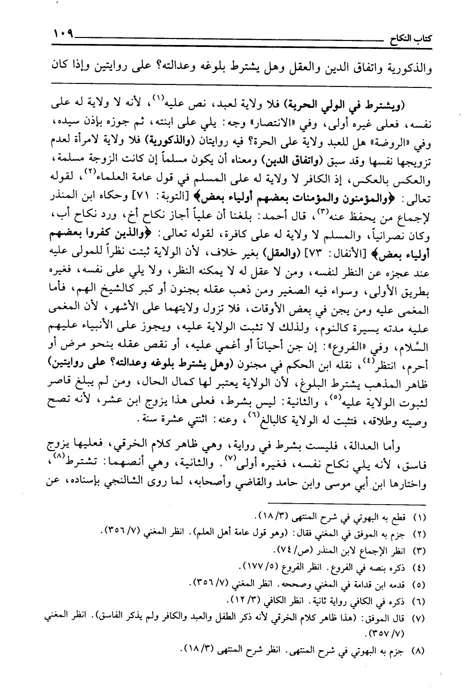 (وَيُشْتَرَطُ فِي الْوَلِيِّ الْحُرِّيَّةُ) فَلَا وِلَايَةَ لِعَبْدٍ، نَصَّ عَلَيْهِ ; لِأَنَّهُ لَا وِلَايَةَ لَهُ عَلَى نَفْسِهِ، فَعَلَى غَيْرِهِ أَوْلَى، وَفِي " الِانْتِصَارِ " وَجْهٌ: يَلِي عَلَى ابْنَتِهِ، ثُمَّ جَوَّزَهُ بِإِذْنِ سَيِّدِهِ، وَفِي " الرَّوْضَةِ ": هَلْ لِلْعَبْدِ وِلَايَةٌ عَلَى الْحُرَّةِ؛ فِيهِ رِوَايَتَانِ (وَالذُّكُورِيَّةُ) فَلَا وِلَايَةَ لِامْرَأَةٍ ; لِعَدَمِ تَزْوِيجِهَا نَفْسَهَا، وَقَدْ سَبَقَ، (وَاتِّفَاقُ الدِّينِ) وَمَعْنَاهُ: أَنْ يَكُونَ مُسْلِمًا إِنْ كَانَتِ الزَّوْجَةُ مُسْلِمَةً، وَالْعَكْسُ بِالْعَكْسِ ; إِذِ الْكَافِرُ لَا وِلَايَةَ لَهُ عَلَى الْمُسْلِمِ فِي قَوْلِ عَامَّةِ الْعُلَمَاءِ ; لِقَوْلِهِ تَعَالَى {وَالْمُؤْمِنُونَ وَالْمُؤْمِنَاتُ بَعْضُهُمْ أَوْلِيَاءُ بَعْضٍ} [التوبة: 71] وَحَكَاهُ ابْنُ الْمُنْذِرِ لِإِجْمَاعِ مَنْ يَحْفَظُ عَنْهُ، قَالَ أَحْمَدُ: بَلَغَنَا أَنَّ عَلِيًّا أَجَازَ نِكَاحَ أَخٍ، وَرَدَّ نِكَاحَ أَبٍ وَكَانَ نَصْرَانِيًّا، وَالْمُسْلِمُ لَا وِلَايَةَ لَهُ عَلَى كَافِرَةٍ ; لِقَوْلِهِ تَعَالَى {وَالَّذِينَ كَفَرُوا بَعْضُهُمْ أَوْلِيَاءُ بَعْضٍ} [الأنفال: 73] (وَالْعَقْلُ) بِغَيْرِ خِلَافٍ ; لِأَنَّ الْوِلَايَةَ تَثْبُتُ نَظَرًا لِلْمَوْلَى عَلَيْهِ عِنْدَ عَجْزِهِ عَنِ النَّظَرِ لِنَفْسِهِ، وَمَنْ لَا عَقْلَ لَهُ لَا يُمْكِنُهُ النَّظَرُ، وَلَا يَلِي عَلَى نَفْسِهِ فَغَيْرُهُ - بِطَرِيقِ الْأَوْلَى، وَسَوَاءٌ فِيهِ الصَّغِيرُ، وَمَنْ ذَهَبَ عقله بِجُنُونٍ، أَوْ كِبَرٍ كَالشَّيْخِ الْهَرَمِ، فَأَمَّا الْمُغْمَى عَلَيْهِ وَمَنْ يُجَنُّ فِي بَعْضِ الْأَوْقَاتِ فَلَا تزول وِلَايَتُهُمَا عَلَى الْأَشْهَرِ ; لِأَنَّ الْمُغْمَى عَلَيْهِ مُدَّتُهُ يَسِيرَةٌ كَالنَّوْمِ ; وَلِذَلِكَ لَا تَثْبُتُ الْوِلَايَةُ عَلَيْهِ، وَيَجُوزُ عَلَى الْأَنْبِيَاءِ - عَلَيْهِمْ السَّلَامُ -، وَفِي " الْفُرُوعِ ": إِنْ جُنَّ أَحْيَانًا، أَوْ أُغْمِيَ عَلَيْهِ، أَوْ نَقَصَ عَقْلُهُ بِنَحْوِ مَرَضٍ أَوْ أَحْرَمَ، انْتُظِرَ، نَقَلَهُ ابْنُ الْحَكَمِ فِي مَجْنُونٍ (وَهَلْ يُشْتَرَطُ بُلُوغُهُ وَعَدَالَتُهُ؟ عَلَى رِوَايَتَيْنِ) ظَاهِرُ الْمَذْهَبِ يُشْتَرَطُ الْبُلُوغُ ; لِأَنَّ الْوِلَايَةَ يُعْتَبَرُ لَهَا كَمَالُ الْحَالِ، وَمَنْ لَمْ يَبْلُغْ قَاصِرٌ ; لِثُبُوتِ الْوِلَايَةِ عَلَيْهِ، وَالثَّانِيَةُ: لَيْسَ بِشَرْطٍ، فَعَلَى هَذَا يُزَوِّجُ ابْنُ عَشْرٍ ; لِأَنَّهُ تَصِحُّ وَصِيَّتُهُ وَطَلَاقُهُ، فَتَثْبُتُ لَهُ الْوِلَايَةُ كَالْبَالِغِ، وَعَنْهُ: اثْنَتَيْ عَشْرَةَ سَنَةً.