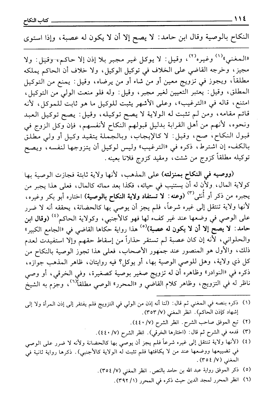النِّكَاحِ بِالْوَصِيَّةِ، وَقَالَ ابْنُ حَامِدٍ: لَا يَصِحُّ إِلَّا أَنْ لَا يَكُونَ لَهُ عُصْبَةٌ.
